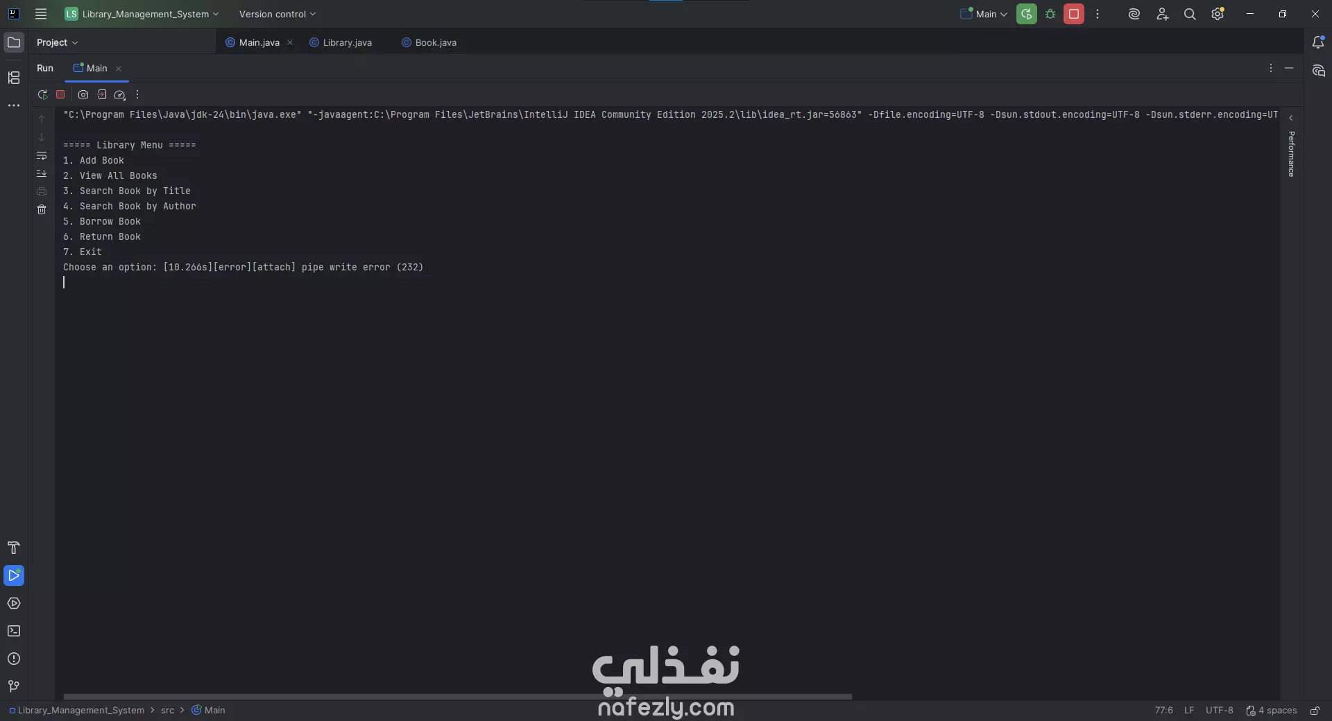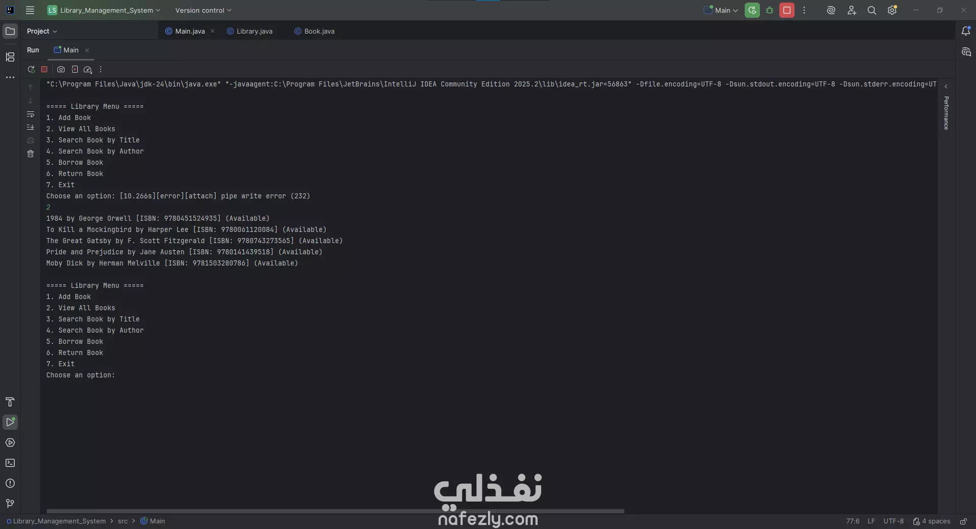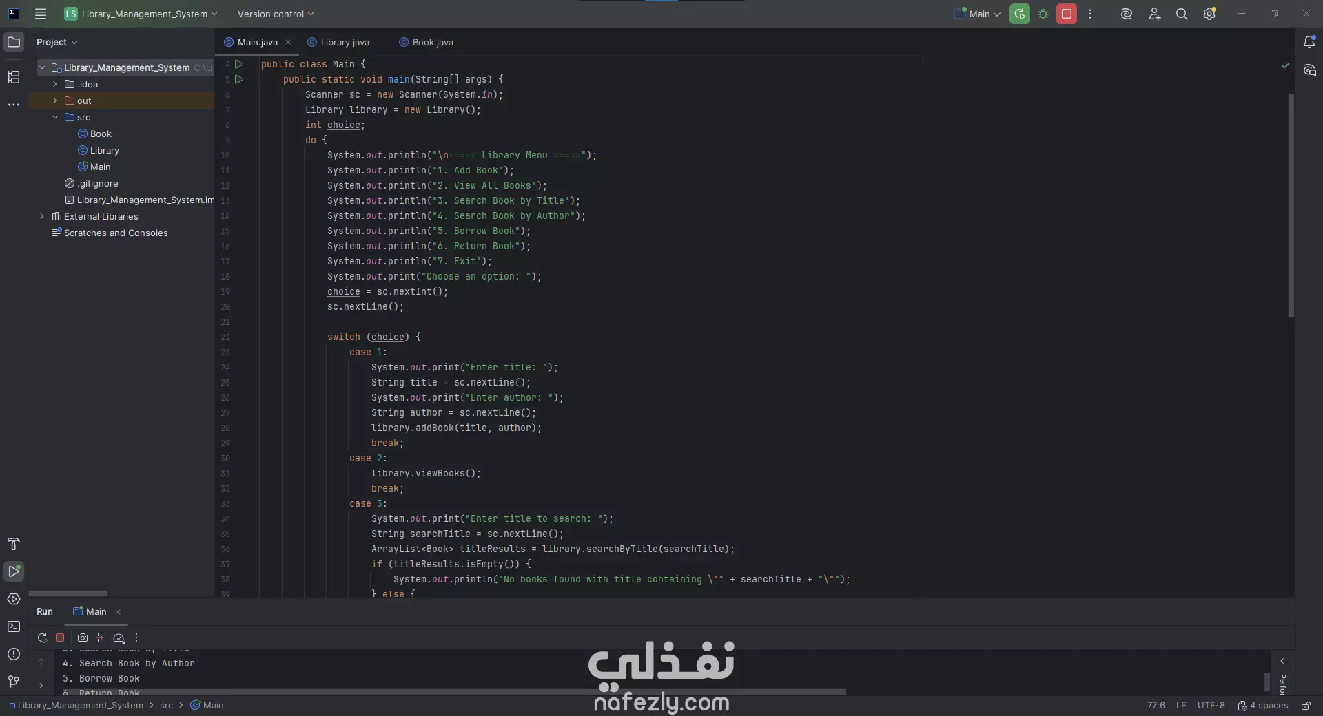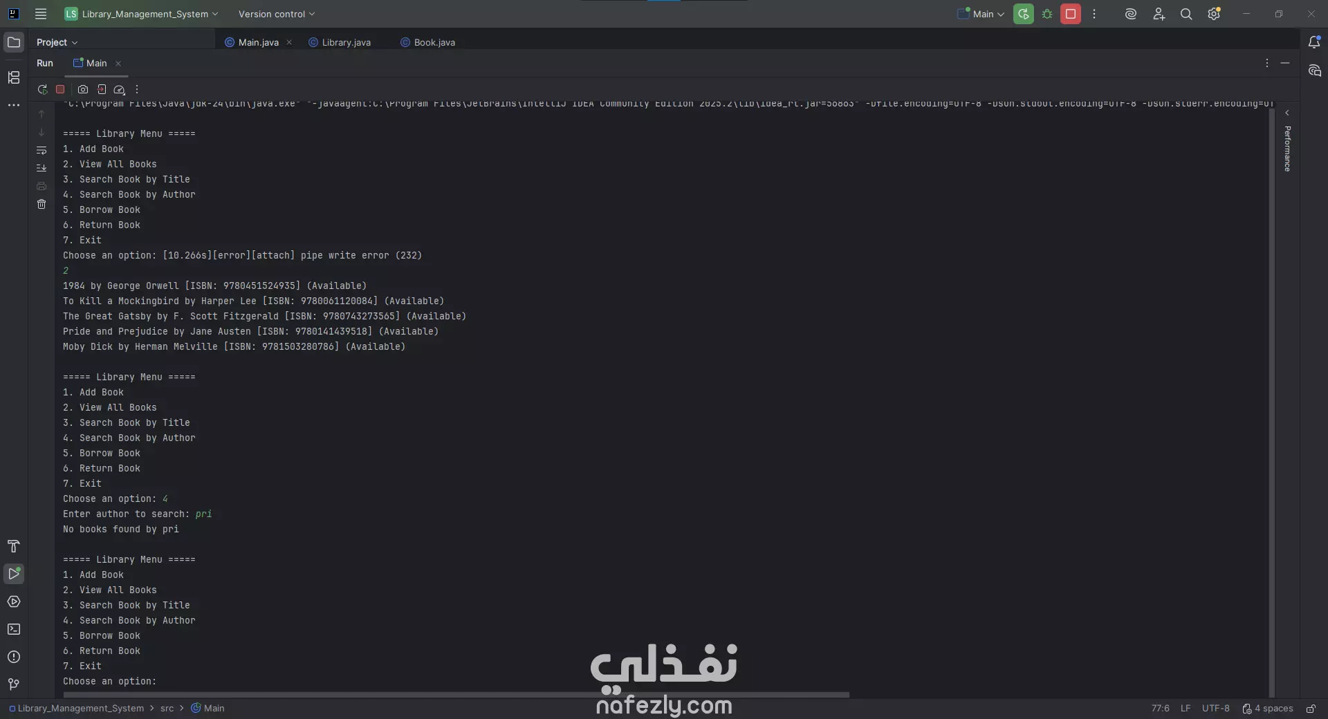 برمجة تطبيق مكتبي (Console-Based Application) بلغة Java لإدارة مكتبة بسيطة تشمل وظائف مثل: إضافة كتب. عرض جميع الكتب. البحث عن الكتب حسب العنوان أو الكاتب. استعارة الكتب وإرجاعها. الخروج من النظام. مميزات العمل: إدارة الكتب : يسمح بإضافة، عرض، والبحث عن الكتب باستخدام عنوان أو اسم المؤلف. استعارة وإرجاع الكتب : إمكانية استعارة أو إرجاع كتاب معيّن. واجهة بسيطة للمستخدم : يتم التفاعل مع المستخدم عبر قائمة نصيّة تظهر في موجه الأوامر (Console). البحث الذكي : البحث يتم من خلال جزئية من العنوان أو المؤلف. تطبيق خفيف وسريع : لا يحتاج إلى واجهة رسومية ثقيلة، ويعمل مباشرة من الطرفية. طريقة التنفيذ: 1. اللغة والأدوات: لغة البرمجة: Java بيئة التطوير: IntelliJ IDEA JDK: الإصدار 24 2. الهيكل البرمجي: يتكوّن المشروع من ثلاث ملفات رئيسية: Main.java: يحتوي على القائمة الرئيسية والتفاعل مع المستخدم. Library.java: يحتوي على الدوال والعمليات الخاصة بإدارة الكتب. Book.java: يحتوي على نموذج بيانات (Model) يمثل كائن الكتاب (Book Object). 3. طريقة العمل: يتم تشغيل البرنامج من خلال Main.java. تظهر قائمة للمستخدم فيها الخيارات (1 إلى 7). المستخدم يختار رقم العملية، مثل: 1 → لإضافة كتاب (يُطلب منه إدخال العنوان والمؤلف). 2 → لعرض الكتب المخزنة. 3 → للبحث حسب العنوان. 4 → للبحث حسب المؤلف. 5 → لاستعارة كتاب. 6 → لإرجاع كتاب. 7 → للخروج من النظام.