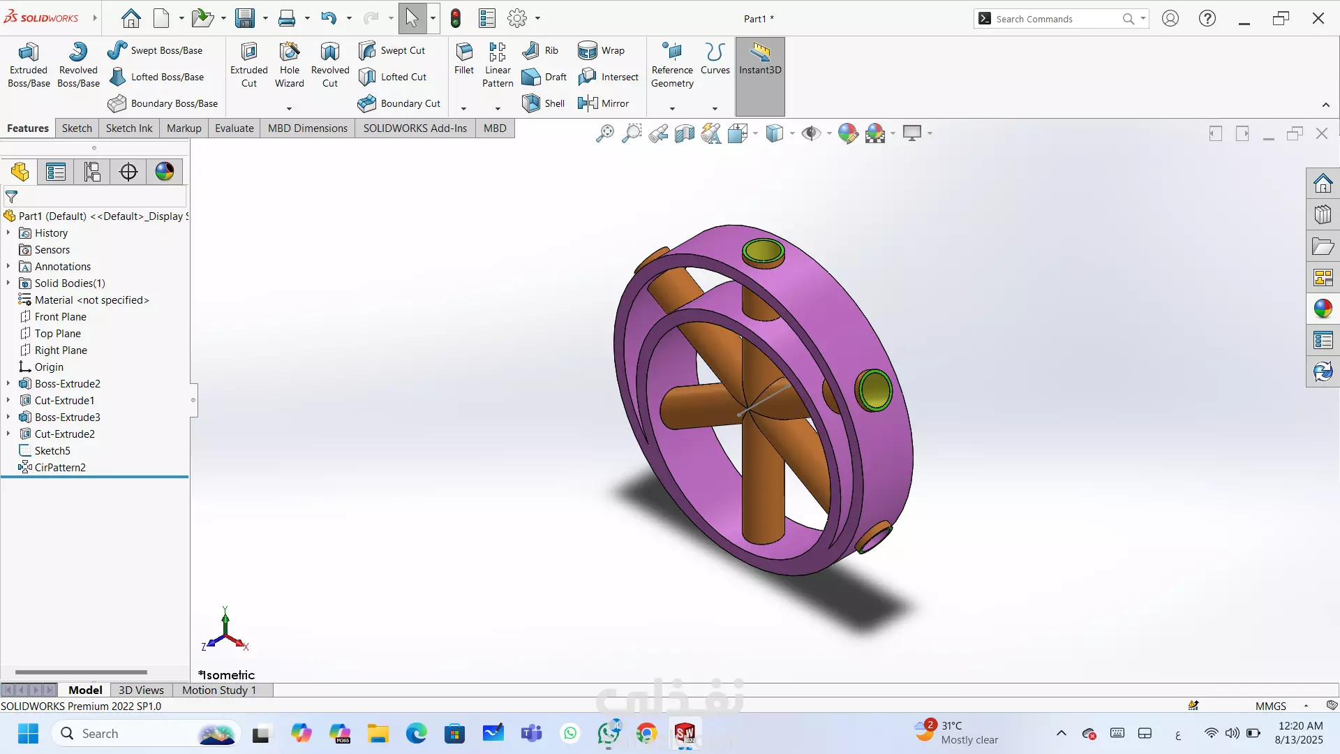 م إنشاء نموذج ثلاثي الأبعاد (3D) باستخدام برنامج SolidWorks يوضح مكوّن ميكانيكي دائري الشكل يحتوي على ريش داخلية وأجزاء مثقبة.