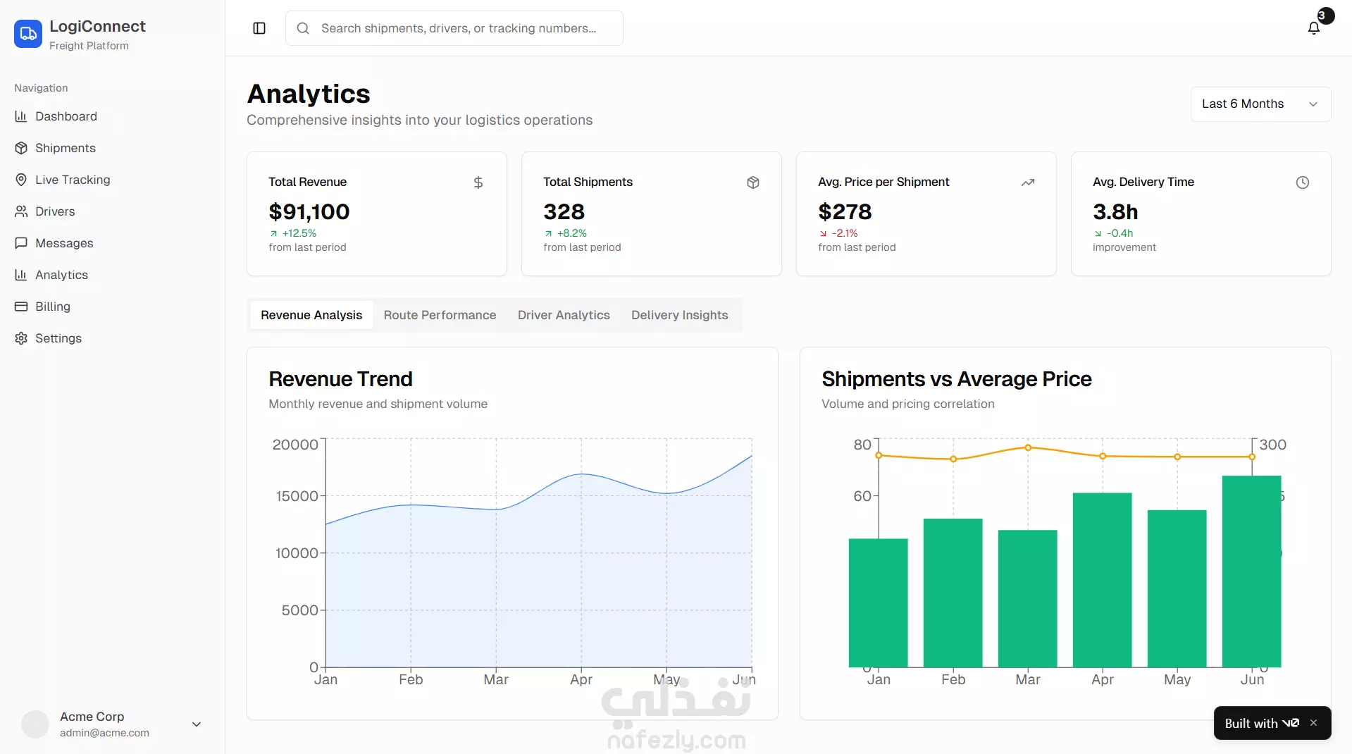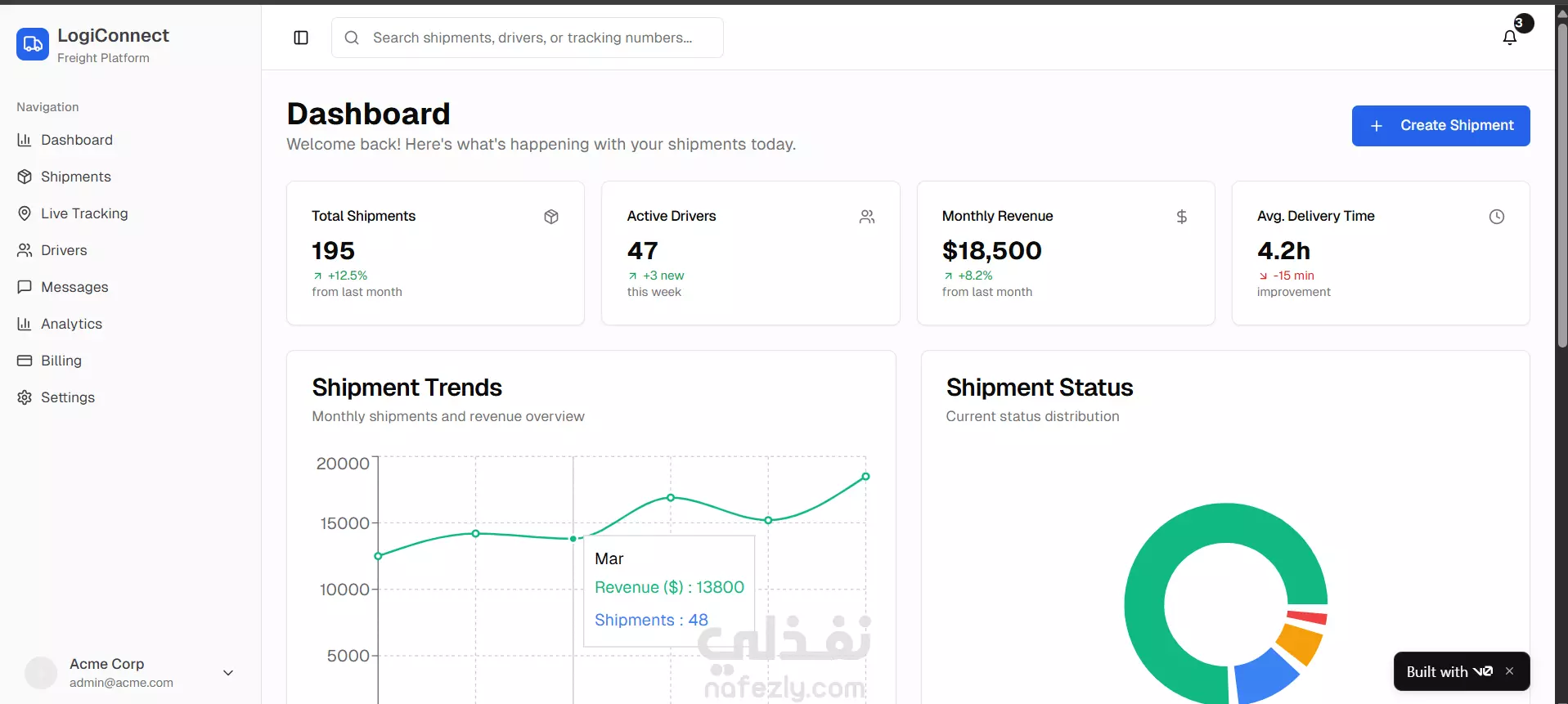 A comprehensive digital freight brokerage platform built with Next.js, designed to streamline logistics operations in the Middle East and North Africa region. LogiConnect connects companies with drivers through an intelligent web dashboard and mobile application ecosystem.