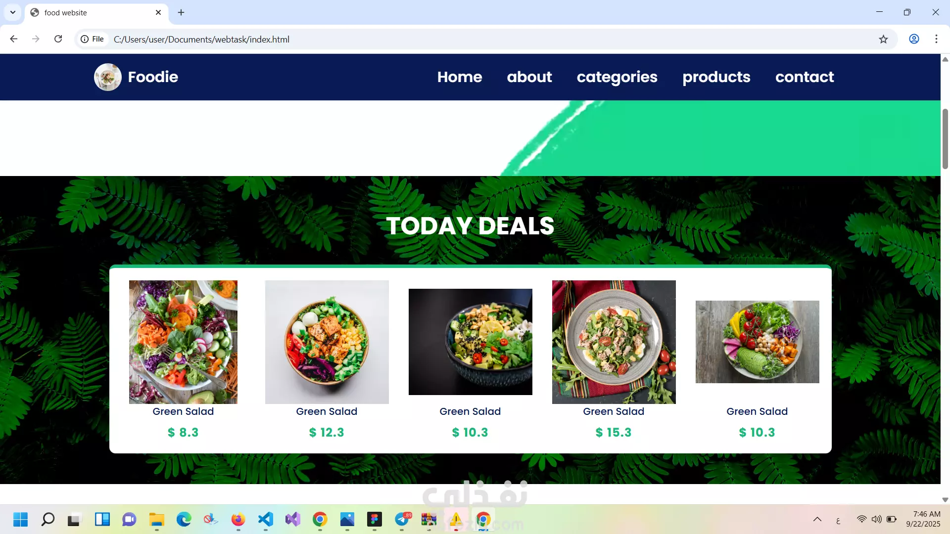 قمت بتطوير واجهة لموقع ويب تجريبي خاص بعرض منتجات الطعام الصحي. الموقع يحتوي على: شريط تنقّل (Navbar) تفاعلي يظل ثابتًا أثناء التمرير. قسم رئيسي (Home Section) مع رسالة ترحيب وصورة جذابة. قسم العروض (Today Deals) لعرض منتجات مختارة بأسعار. أقسام الفئات (Categories) لعرض الأنواع (أسماك – دجاج – سلطات). قسم المنتجات (Products) منظم في كروت مع أيقونة عربة تسوق. قسم التواصل (Contact Us) مع فورم لإرسال رسالة + روابط السوشيال. المشروع يوضح قدرتي على بناء صفحات ويب متكاملة وResponsive باستخدام HTML, CSS, JavaScript.