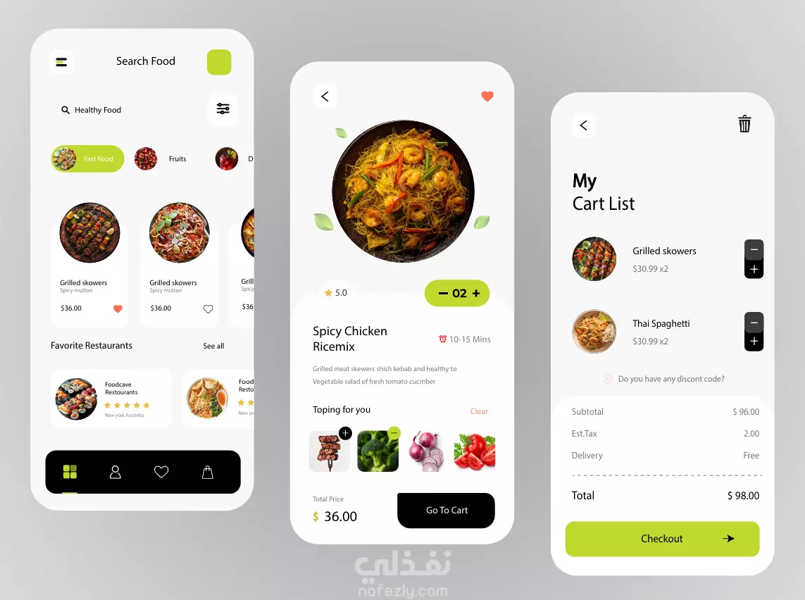تصميم لتطبيق توصيل الطعام تم إنشاؤه كمشروع تدريبي. المظهر الخارجي مستوحى من تصميم موجود مسبقًا، لكنني قمت بإنشاء كل شيء بنفسي باستخدام ألوان مختلفة وصور جديدة كليًا.