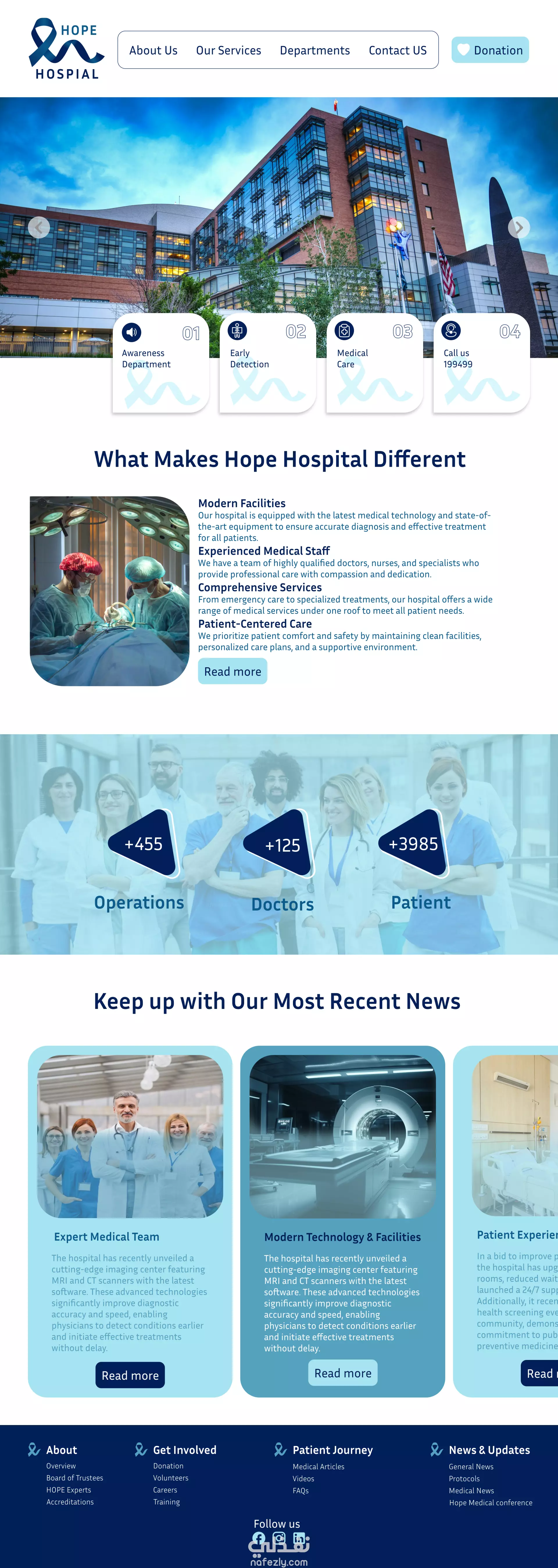 تم تصميم واجهة موقع لمستشفى Hope Hospital باستخدام برنامج Figma، حيث ركزت على إخراج تصميم حديث وبسيط يراعي هوية المستشفى ويعكس الطابع الطبي والإنساني للمكان. تصميم الواجهة (UI/UX): تم الاهتمام بتوزيع العناصر بشكل متناسق ليسهّل تجربة المستخدم، مع استخدام ألوان هادئة مرتبطة بالمجال الطبي مثل الأزرق والأبيض لتعزيز الثقة والراحة البصرية. التعديل على الصور: تم استخدام Adobe Photoshop لتحسين جودة الصور والتعديل عليها بحيث تتناسب مع هوية التصميم، وإضافة لمسات بصرية تجعل الموقع أكثر احترافية وجاذبية. البروتوتايب والتفاعلات: تم إنشاء عدة نماذج أولية (Prototypes) داخل Figma لتوضيح طريقة عمل الموقع وتجربة التنقل بين صفحاته. كما تمت إضافة تفاعلات (Interactions) على الأزرار والعناصر بحيث يتغير شكلها أو لونها عند الضغط عليها، مما يعزز تجربة المستخدم ويجعل الموقع أكثر حيوية. مميزات المشروع تصميم متجاوب يلبي احتياجات المستخدمين. واجهة عصرية وبسيطة وسهلة التصفح. إضافة تفاعلات بصرية تزيد من تفاعل الزوار مع الموقع. تحسين الصور لتبدو بجودة عالية ومتناسقة مع التصميم العام.