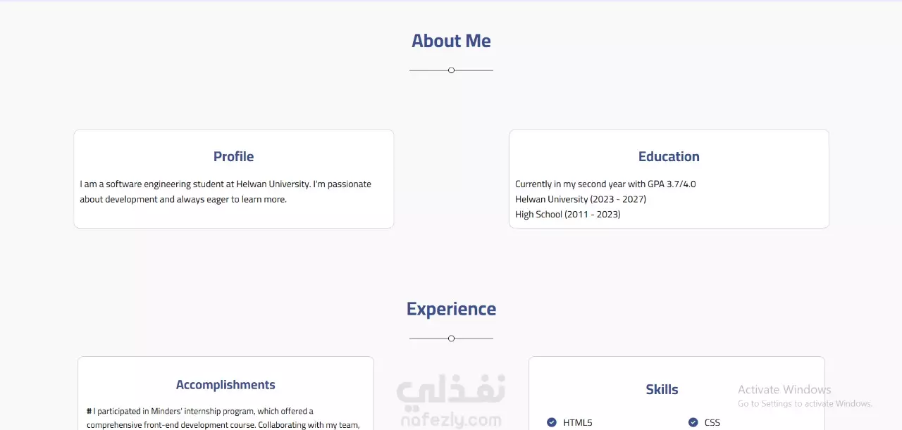 عندي خبرة في تطوير مواقع باستخدام HTML, CSS, Bootstrap, و JavaScript، وقمت بتنفيذ مشاريع مشابهة (مثل: [portfolio شخصي,fashion store project,calculator and we are making as a team a website for a client])