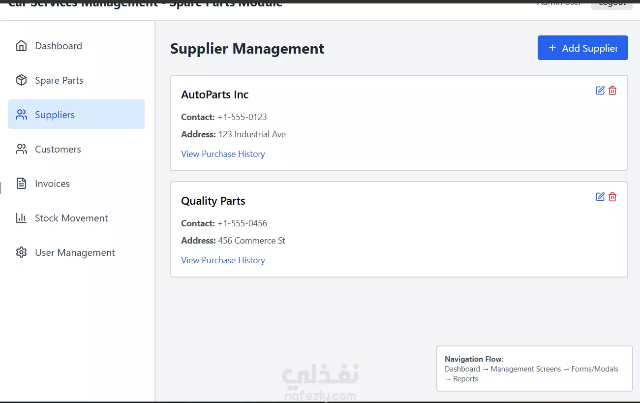 يهدف نظام إدارة قطع الغيار إلى تنظيم ومتابعة جميع العمليات المتعلقة بقطع الغيار داخل المؤسسة أو ورش الصيانة. يتيح النظام تسجيل بيانات القطع (الاسم، الكود، النوع، السعر، الكمية المتاحة)، ومتابعة المخزون بشكل دقيق لتفادي النقص أو الزيادة. كما يوفّر إمكانية تتبّع حركة القطع بين الموردين، المخازن، والفنيين، مع إصدار تقارير دورية عن الاستهلاك والمبيعات. يساعد النظام في تحسين كفاءة إدارة الموارد، تقليل التكاليف، وضمان سرعة تلبية احتياجات العملاء أو أعمال الصيانة.