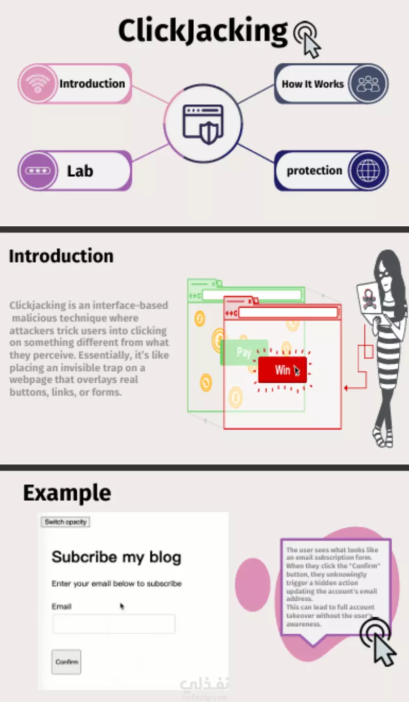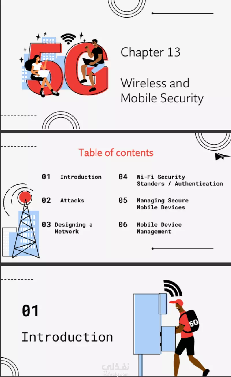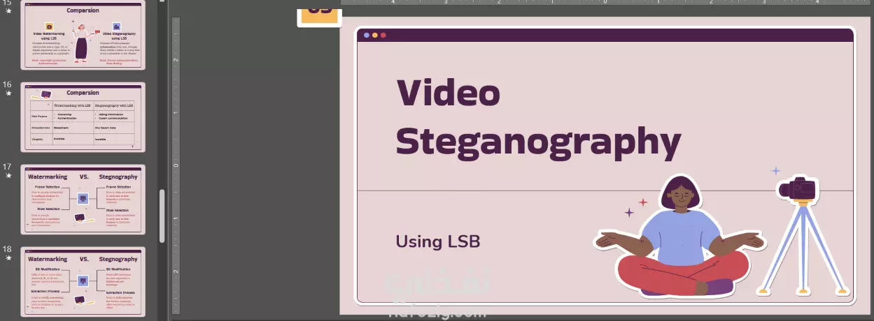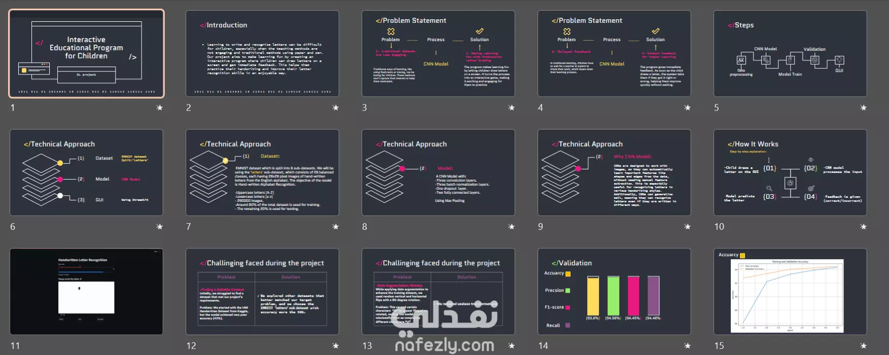 قدمت عروض تقديمية متنوعة بأساليب تصميم مختلفة لتناسب موضوع كل مشروع، ومن أبرزها: Interactive Educational Program for Children عرض تفاعلي يشرح مشكلة تعليم الأطفال كتابة الأحرف مع الحلول التقنية وخطوات التنفيذ، متضمنًا رسوم بيانية وتحليلات أداء. 5G Wireless and Mobile Security برزنتيشن أكاديمي منسق حول أمن الشبكات اللاسلكية والمحمولة، بتصميم عصري وأيقونات توضيحية، يشمل: مقدمة، أنواع الهجمات، تصميم الشبكات، وإدارة الأجهزة المحمولة. Video Steganography Using LSB عرض توضيحي عن إخفاء المعلومات داخل الفيديو باستخدام تقنية LSB، مع مقارنة بين تقنيات الـWatermarking و Steganography ورسوم توضيحية جذابة.