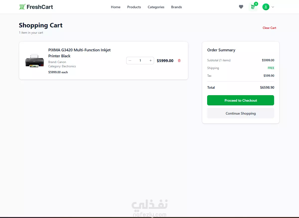 عربة تسوق (Shopping Cart) مع إمكانية إضافة حذف المنتجات وتحديث الكميات.