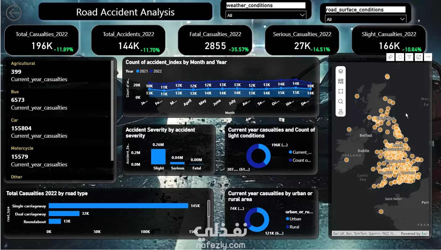 لوحة معلومات Power BI لتحليل بيانات حوادث الطرقات مع رؤى حول الخطورة والأسباب والاتجاهات الزمنية والمواقع. صُممت باستخدام تقنيات Power BI وPower Query وتصور البيانات لتحديد النقاط الساخنة ومراقبة الأنماط ودعم قرارات السلامة على الطرق.
