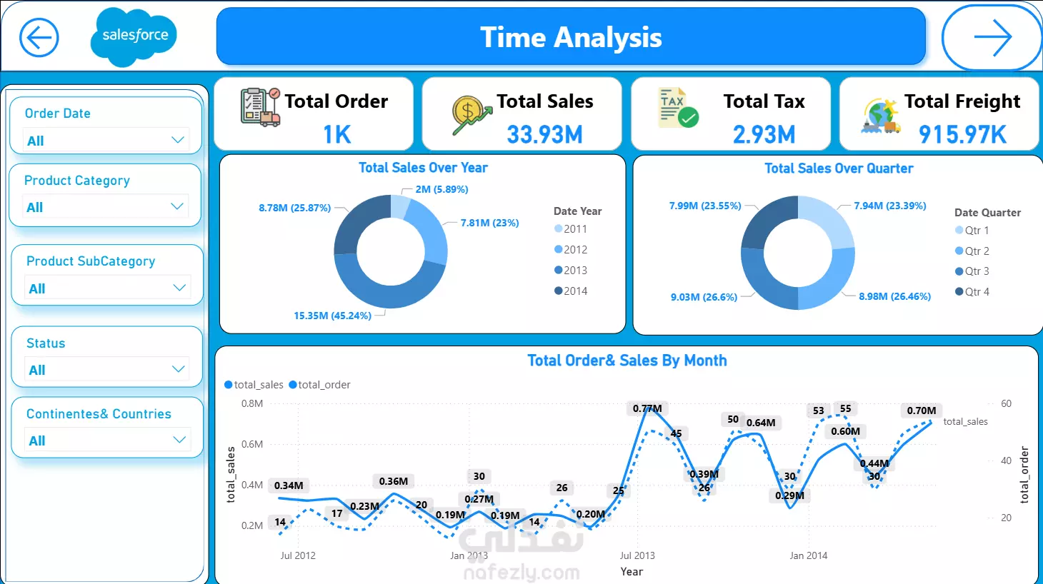 قمت بتصميم وتطوير تقرير تفاعلي لمتابعة المبيعات باستخدام Power BI يتيح عرض وتحليل مؤشرات الأداء الرئيسية بشكل مبسط واحترافي. يشمل العمل: تتبع مؤشرات الأداء الرئيسية مثل: عدد الطلبات، إجمالي المبيعات، الضرائب، وتكاليف الشحن. تحليل المنتجات الأكثر مبيعًا، أداء المناطق الجغرافية، وحالة الطلبات. إضافة تحليلات زمنية (شهرية، ربع سنوية، سنوية) لفهم اتجاهات المبيعات على المدى القصير والطويل. إنشاء لوحات تحكم (Dashboards) تفاعلية مع فلاتر تسهّل استكشاف البيانات حسب الفترات الزمنية أو المناطق أو المنتجات. تصميم واجهة بصرية جذابة ومرتبة تسهّل على الإدارة الوصول إلى المعلومات بسرعة. هذا التقرير يساعد الشركات على فهم أداء المبيعات بدقة، تحديد أفضل المنتجات والأسواق، ودعم القرارات الاستراتيجية المبنية على البيانات.