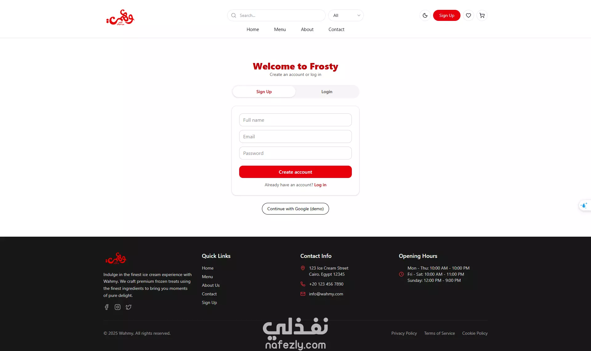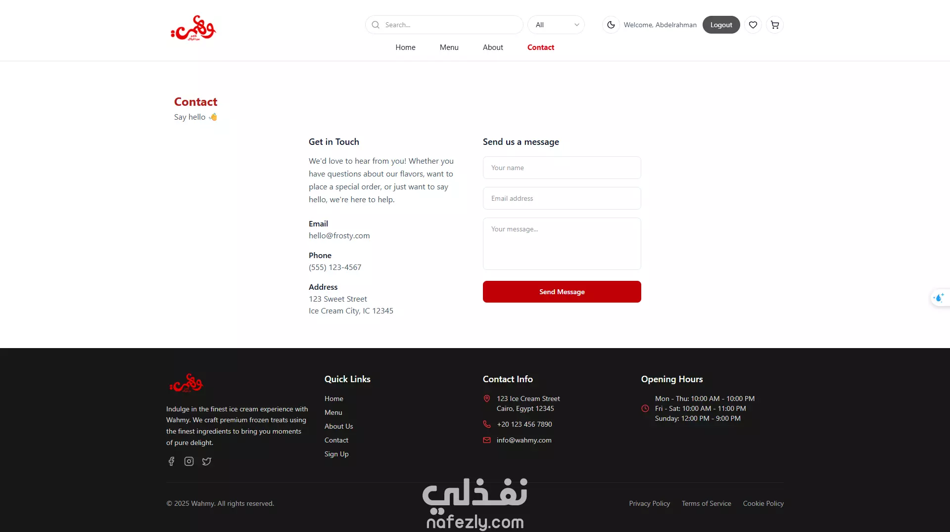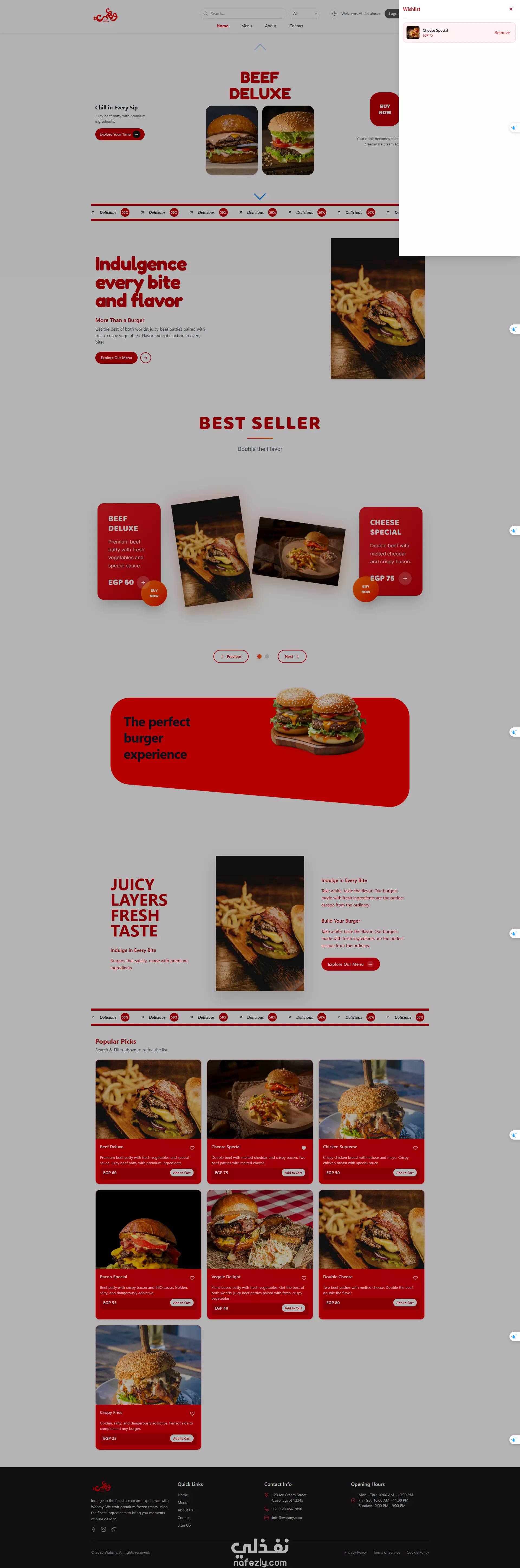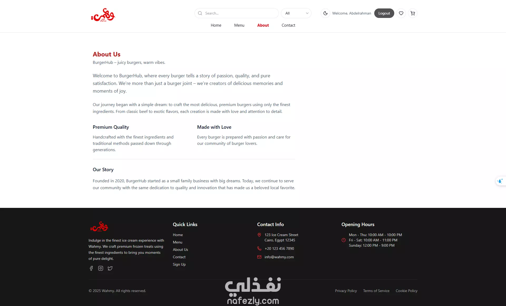 مشروع موقع مطعم ديناميك لطلب الطعام أونلاين مبني باستخدام React و UI Framework (Tailwind CSS)، بيقدّم واجهة حديثة وسهلة الاستخدام مع دعم الوضع الليلي/النهاري. المشروع بيسمح للمستخدم: تصفح قائمة الطعام كاملة . البحث الفوري في المنتجات. عمل فلترة حسب التصنيفات. تسجيل حساب جديد أو تسجيل الدخول (User Authentication). إضافة منتجات إلى سلة المشتريات (Cart) مع إدارة الكميات. حفظ المنتجات المفضلة في Wishlist. تجربة مرنة على جميع الأجهزة (كمبيوتر – موبايل – تابلت). تصميم متجاوب + أنيميشن سلس باستخدام Framer Motion. التقنيات المستخدمة: React (19.1.1) + Vite لتطوير سريع وأداء عالي. Tailwind CSS للتصميم. Framer Motion للأنيميشن. Lucide React للأيقونات. LocalStorage لحفظ بيانات المستخدم.
