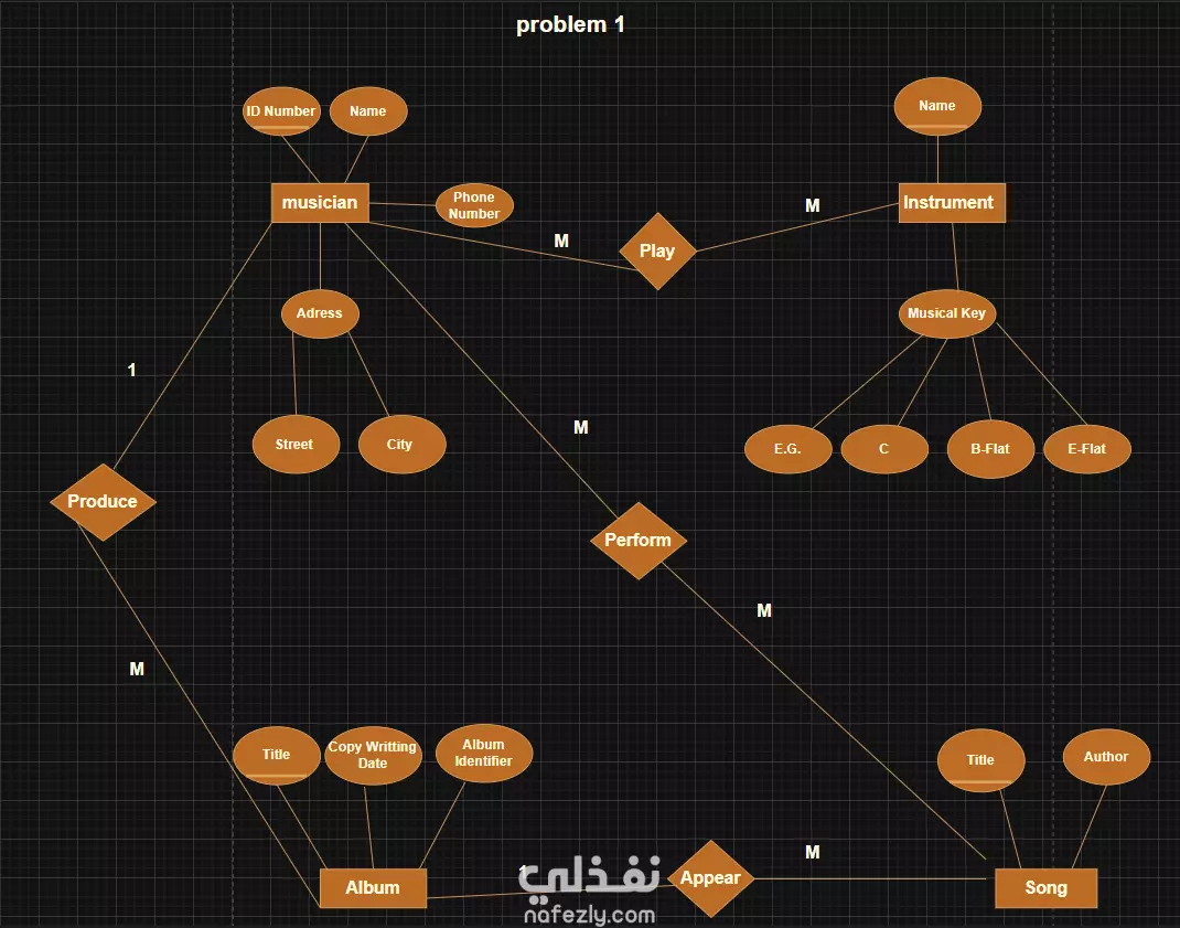 This Entity Relationship Diagram (ERD) illustrates a database structure for a music system. It defines how musicians, instruments, albums, and songs are related, helping to organize and manage data efficiently. The ERD includes relationships such as: A musician can play multiple instruments. Musicians can perform many songs, and each song can be performed by multiple musicians. Musicians can produce multiple albums, and each album contains multiple songs. Each instrument is associated with a musical key (e.g., C, B-Flat, E-Flat).