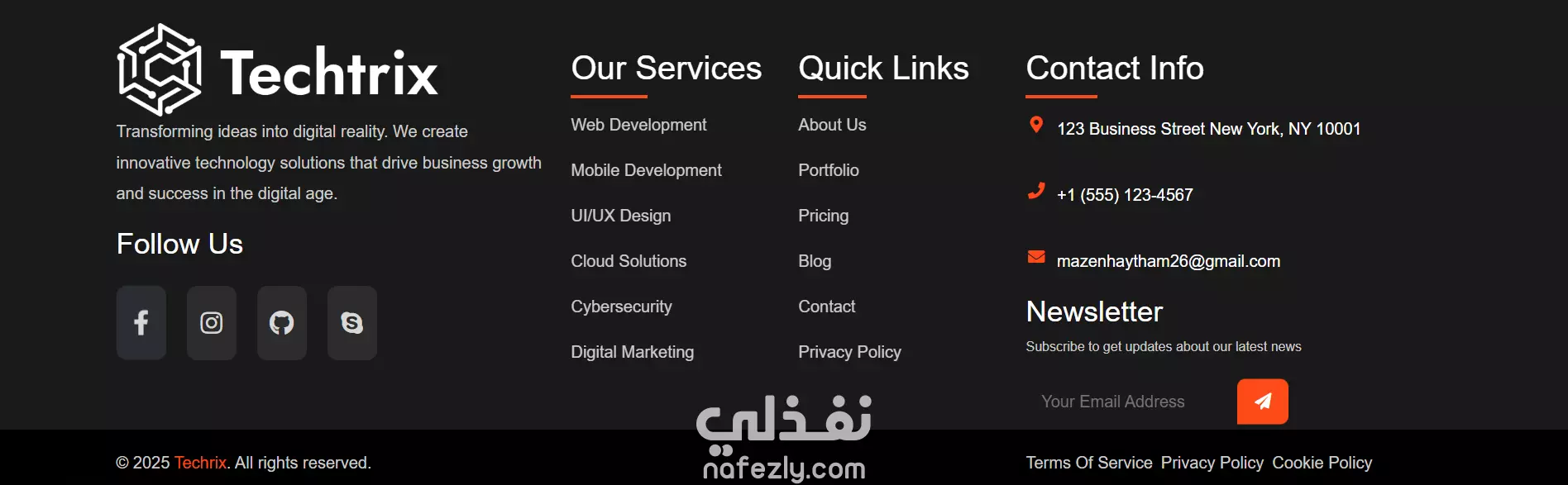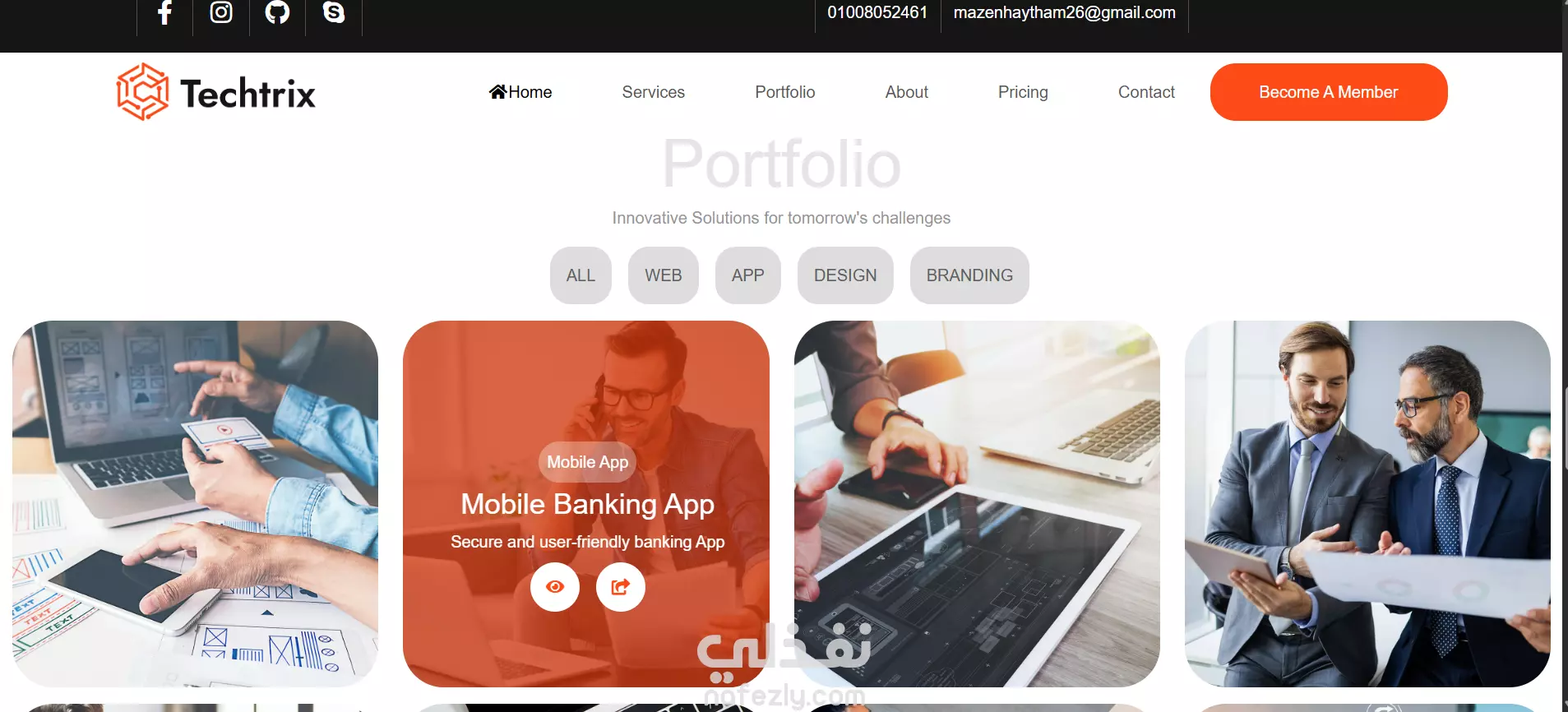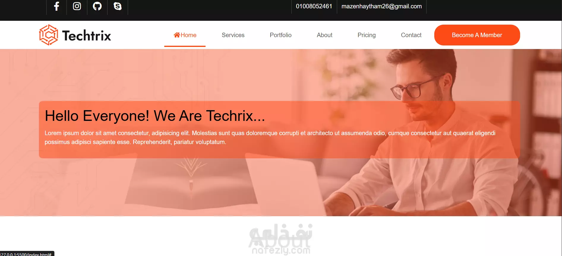 Techrix – IT Solutions Website Techrix هو موقع شركة حلول تكنولوجية (IT Solutions Website) عبارة عن Landing Page حديثة ومتجاوبة (Modern Responsive Landing Page) مصممة لعرض خدمات التحول الرقمي (Digital Transformation) وحلول تكنولوجيا المعلومات (IT Services). يركز المشروع على إبراز التصميم العصري، تجربة مستخدم سلسة (UX/UI)، وسهولة التصفح عبر جميع الأجهزة. 🔹 المهام والمسؤوليات: تصميم وتطوير واجهة مستخدم (UI) احترافية باستخدام HTML5, CSS3, Bootstrap 5. إنشاء Landing Page متكاملة تشمل: Hero Banner، About Us، Services، Portfolio، Blog، Newsletter، Footer. تطبيق Responsive Design لضمان توافق الموقع مع مختلف الأجهزة (Desktop – Tablet – Mobile). استخدام CSS Animations (Animate.css) لتوفير تجربة مستخدم تفاعلية وجذابة. تطوير Portfolio Gallery تفاعلية مع مؤثرات (Hover Effects) وتصنيفات المشاريع. تصميم Blog Section متكامل مع مقالات، مؤلفين، تعليقات، وتواريخ نشر. تنفيذ Sticky Navigation لسهولة التنقل داخل الصفحة. دمج Social Media Integration وروابط تواصل سريعة. 🔹 إنجازات المشروع: بناء موقع متكامل للشركات التقنية يمكن استخدامه كنموذج تسويقي (Corporate Website Prototype). إبراز خبرات في Front-End Development, Responsive Web Design, UI/UX. إظهار القدرة على تطبيق Best Practices في تصميم مواقع الشركات والخدمات. 🔹 التقنيات والأدوات: Languages: HTML5, CSS3. Frameworks & Libraries: Bootstrap 5, Animate.css, Font Awesome. Typography: Google Fonts (Open Sans). Concepts: Responsive Web Design, Landing Page Development, UX/UI Design. Tools: VS Code, Git/GitHub.