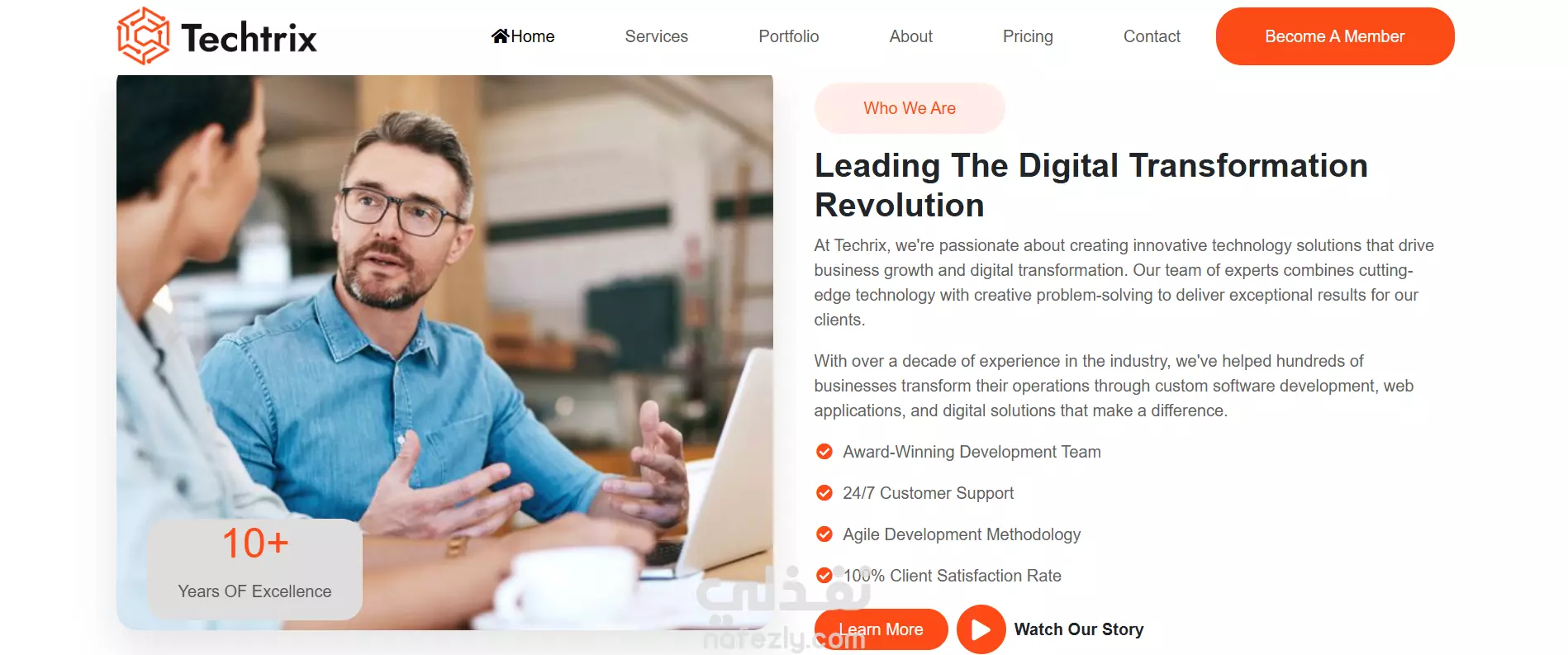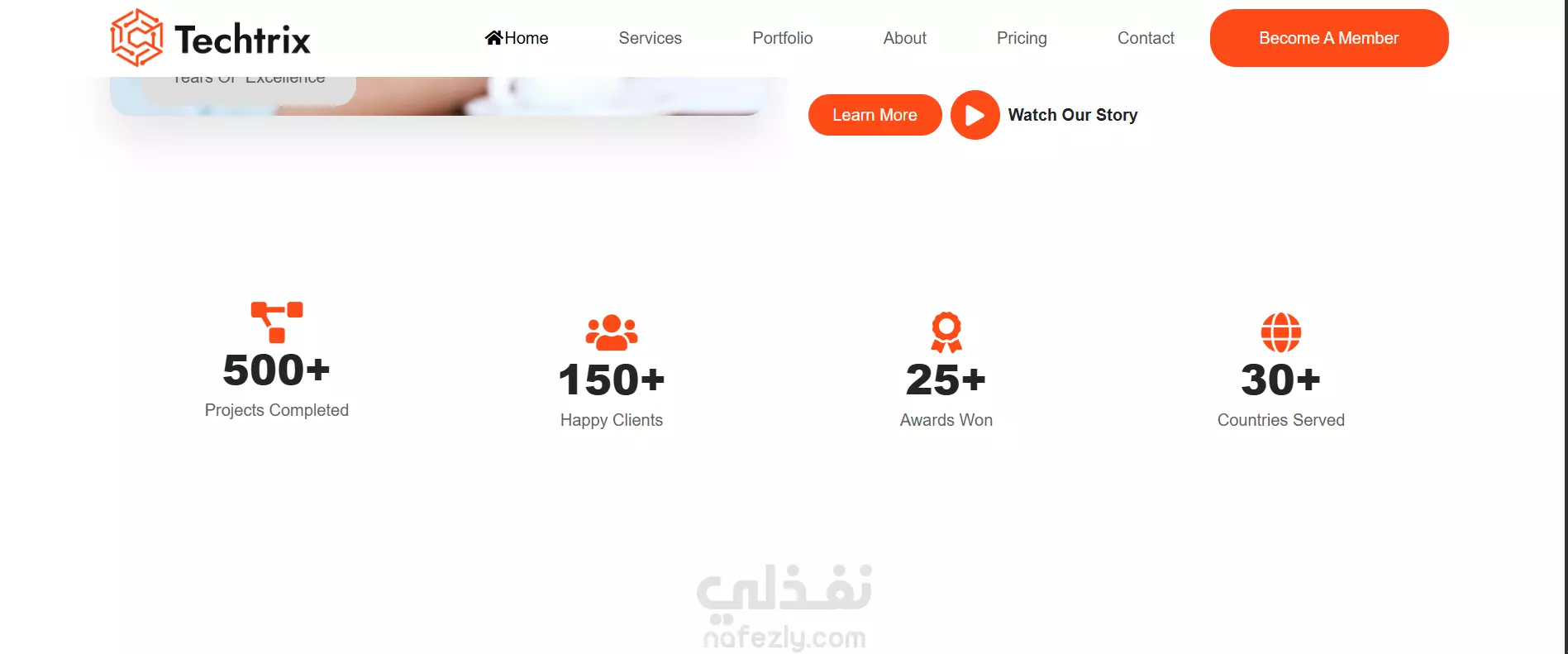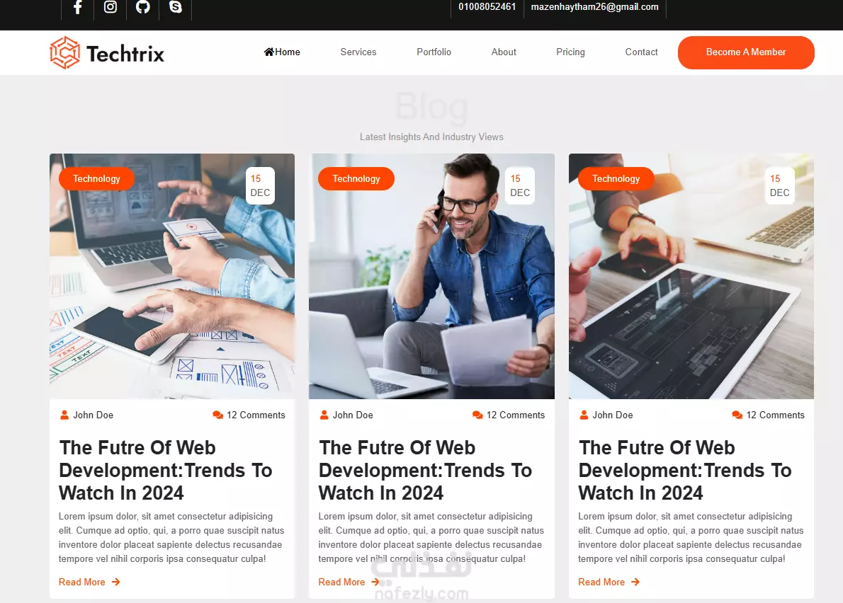 Techrix – IT Solutions Website Techrix هو موقع شركة حلول تكنولوجية (IT Solutions Website) عبارة عن Landing Page حديثة ومتجاوبة (Modern Responsive Landing Page) مصممة لعرض خدمات التحول الرقمي (Digital Transformation) وحلول تكنولوجيا المعلومات (IT Services). يركز المشروع على إبراز التصميم العصري، تجربة مستخدم سلسة (UX/UI)، وسهولة التصفح عبر جميع الأجهزة. 🔹 المهام والمسؤوليات: تصميم وتطوير واجهة مستخدم (UI) احترافية باستخدام HTML5, CSS3, Bootstrap 5. إنشاء Landing Page متكاملة تشمل: Hero Banner، About Us، Services، Portfolio، Blog، Newsletter، Footer. تطبيق Responsive Design لضمان توافق الموقع مع مختلف الأجهزة (Desktop – Tablet – Mobile). استخدام CSS Animations (Animate.css) لتوفير تجربة مستخدم تفاعلية وجذابة. تطوير Portfolio Gallery تفاعلية مع مؤثرات (Hover Effects) وتصنيفات المشاريع. تصميم Blog Section متكامل مع مقالات، مؤلفين، تعليقات، وتواريخ نشر. تنفيذ Sticky Navigation لسهولة التنقل داخل الصفحة. دمج Social Media Integration وروابط تواصل سريعة. 🔹 إنجازات المشروع: بناء موقع متكامل للشركات التقنية يمكن استخدامه كنموذج تسويقي (Corporate Website Prototype). إبراز خبرات في Front-End Development, Responsive Web Design, UI/UX. إظهار القدرة على تطبيق Best Practices في تصميم مواقع الشركات والخدمات. 🔹 التقنيات والأدوات: Languages: HTML5, CSS3. Frameworks & Libraries: Bootstrap 5, Animate.css, Font Awesome. Typography: Google Fonts (Open Sans). Concepts: Responsive Web Design, Landing Page Development, UX/UI Design. Tools: VS Code, Git/GitHub.