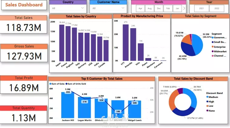 تم إنشاء لوحة تحكم تفاعلية باستخدام Power BI لتقديم تحليلات شاملة عن المبيعات. تعرض اللوحة البيانات الرئيسية مثل إجمالي المبيعات، المبيعات الإجمالية، الأرباح، والكمية الإجمالية. بالإضافة إلى ذلك، تتضمن اللوحة تفاصيل عن المبيعات حسب البلد، المنتج، والخصم، وأداء أفضل 5 عملاء، مع تصنيفات حسب القطاع. تتيح الفلاتر للمستخدم اختيار السنة والشهر واسم العميل لتحليل مخصص. التصميم مبسط واحترافي لسهولة القراءة واتخاذ القرارات.
