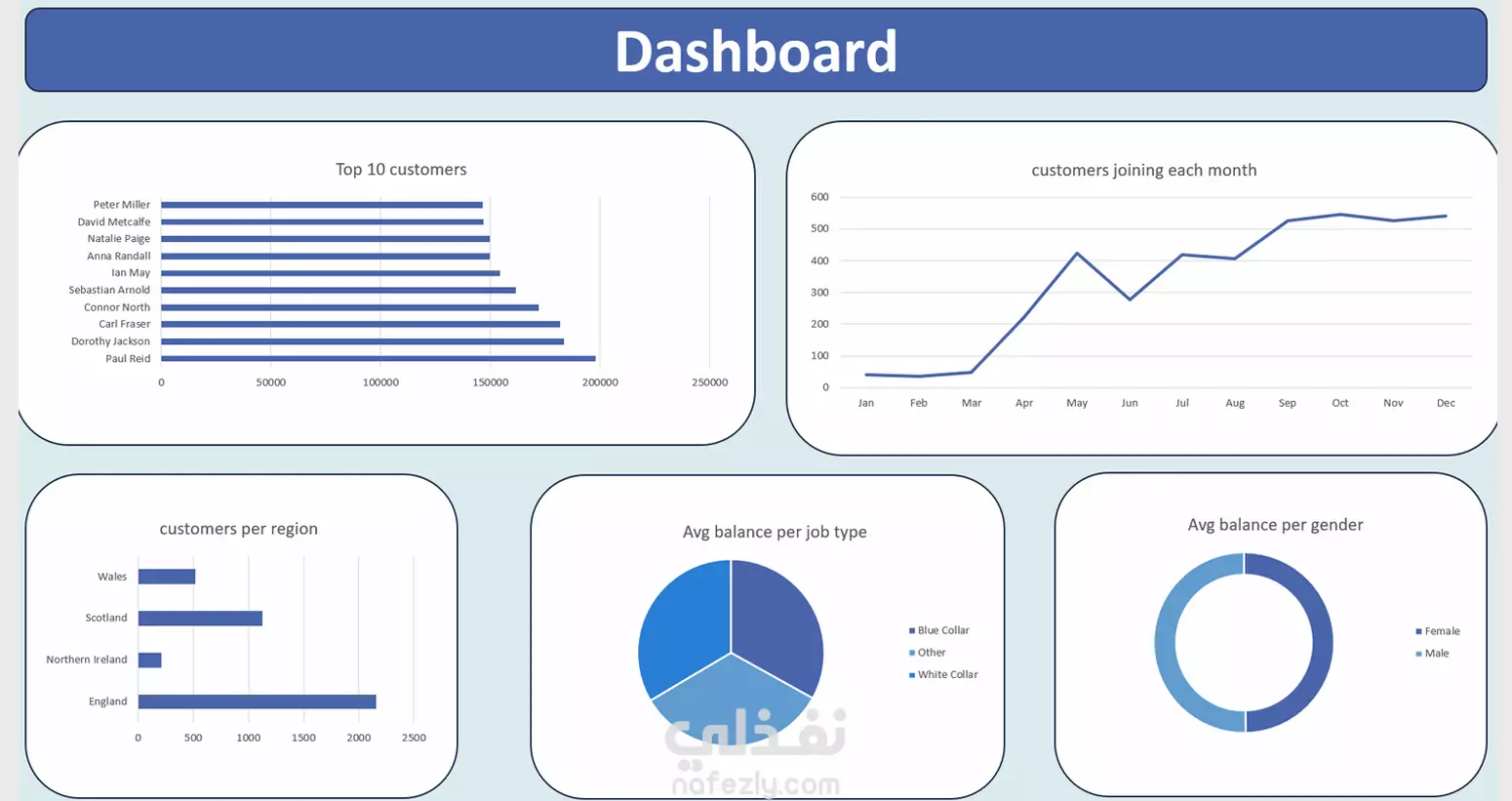 تهدف هذه اللوحة إلى دعم عملية اتخاذ القرار عبر توفير رؤية واضحة حول نمو العملاء، أنماط التوزيع الجغرافي والاجتماعي، مع إبراز العملاء الأكثر قيمة للشركة.