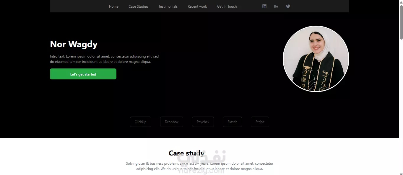 Hero Section → صورة شخصية (أو Avatar) + تعريف بسيط عنك + زر (Hire Me / Contact Me).