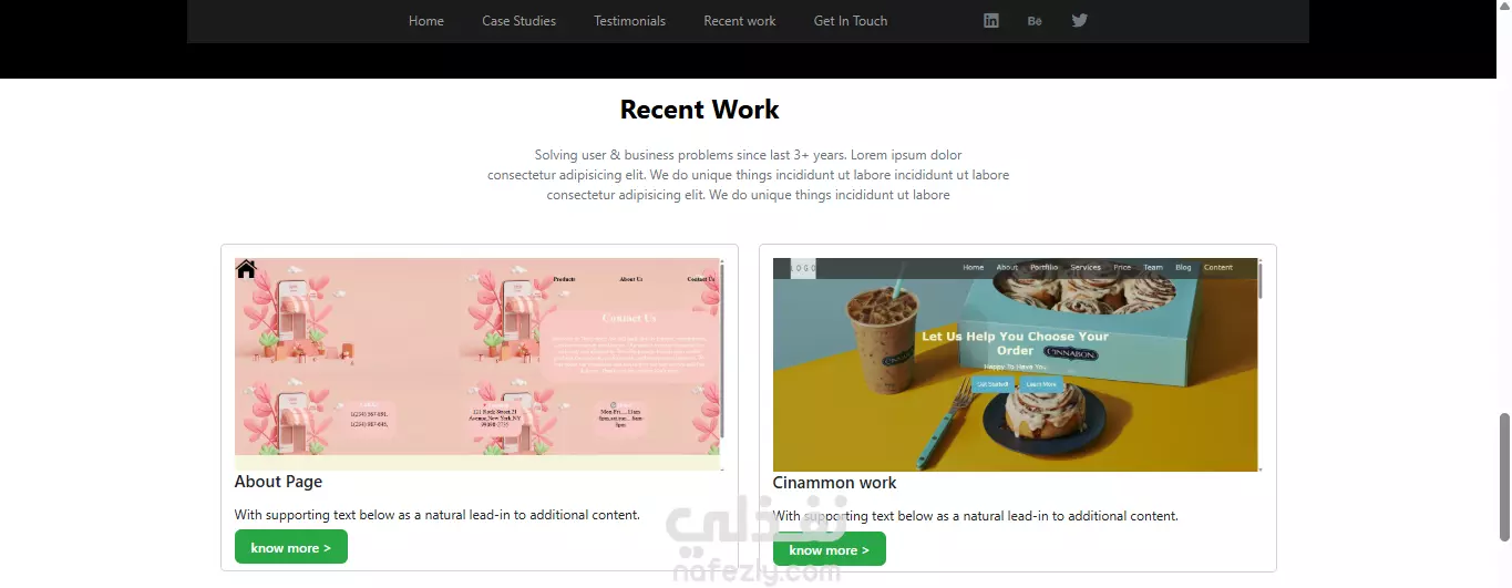 Projects → عرض أعمالك السابقة (كروت أو Grid لصور + وصف قصير + لينك GitHub/Live Demo).