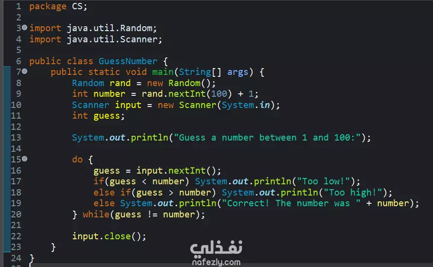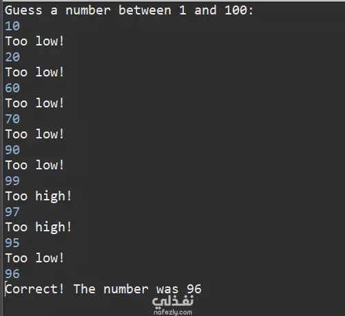 An interactive Java console game where the program generates a random number between 1 and 100, and the user tries to guess it. The program provides hints (“Too high” or “Too low”) until the correct number is guessed. Technologies: Java, Random class, Control structures