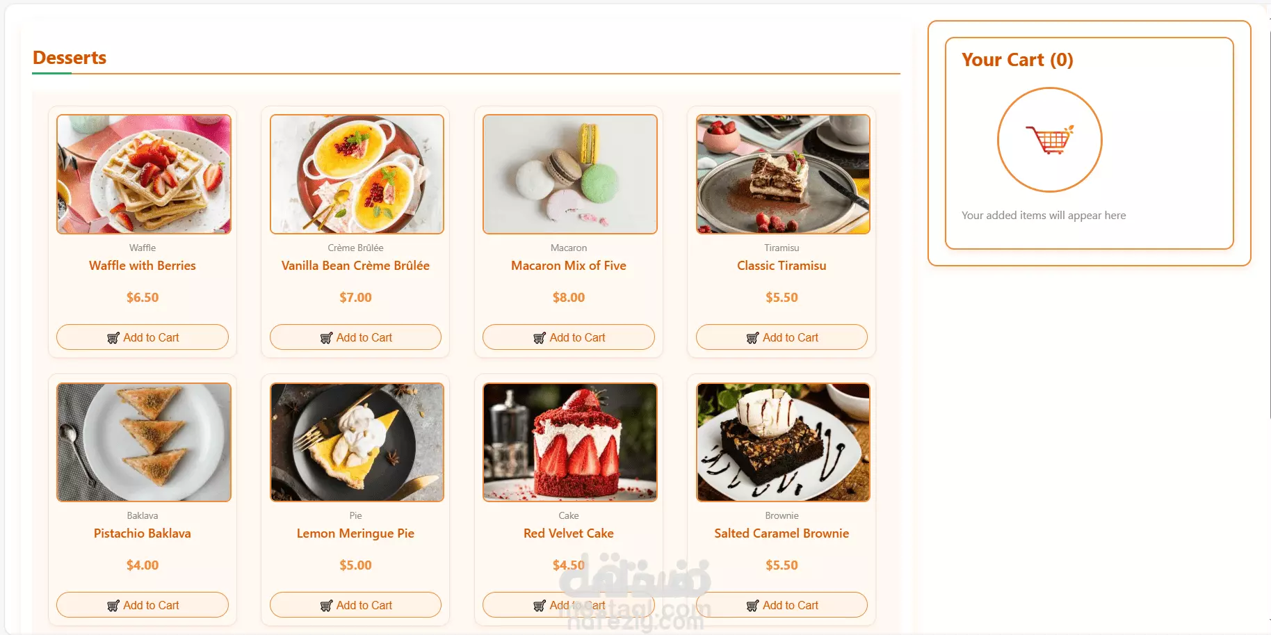 A dynamic e-commerce interface for listing products (such as sweets) from a JSON data source, with fully functional cart management including add/remove items and order confirmation.