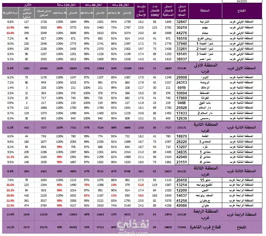 لمطلوب ان هناك تقرير مرسل pdf بمؤشرات الاداء لمناطق معينة وكان المطلوب فعل دوال لعمل نفس التقرير excelولكن على مستوى أقل (سنترالات) فقد تم عمل الاتى 1-الحصول على الداتا المطلوبة وهى كل الاعطال للمنطقة وتنسيقها وتصحيحها 2- الفهم الجيد للمؤشرات وهل يوجد محددات معينة للداتا 3- عمل دوال معينة لاستخراج نفس التقرير ولكن على مستوى السنترالات مثل (count-countif-vlookup-sumif-sum-iferror) يرجى العلم انه تم حذف بعض البيانات من الشيت المرفق حفاظا على سرية البيانات