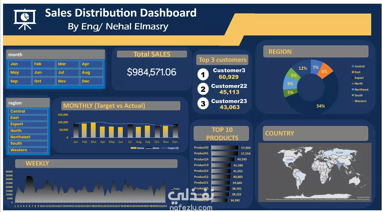 كان مطلوب عمل تحليل لبيانات المبيعات واستخراج ما يلى وعمل عرض له على داينامك داشبورد Total Sales Total sales vs Target per month Total sales per Week Top three customer for sales Top ten product for sales Total sales per region Total sales per country Filtering by using Month and Region