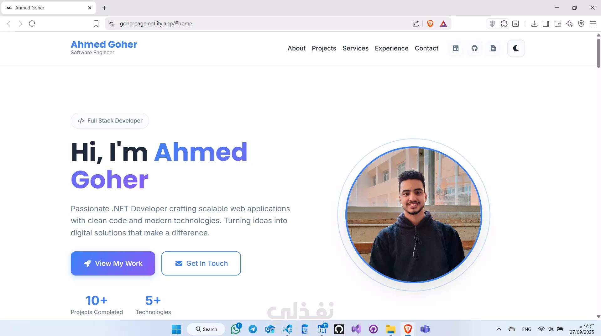 أقسام واضحة مثل: "من أنا"، "الخدمات"، "المشاريع"، و"وسائل التواصل".