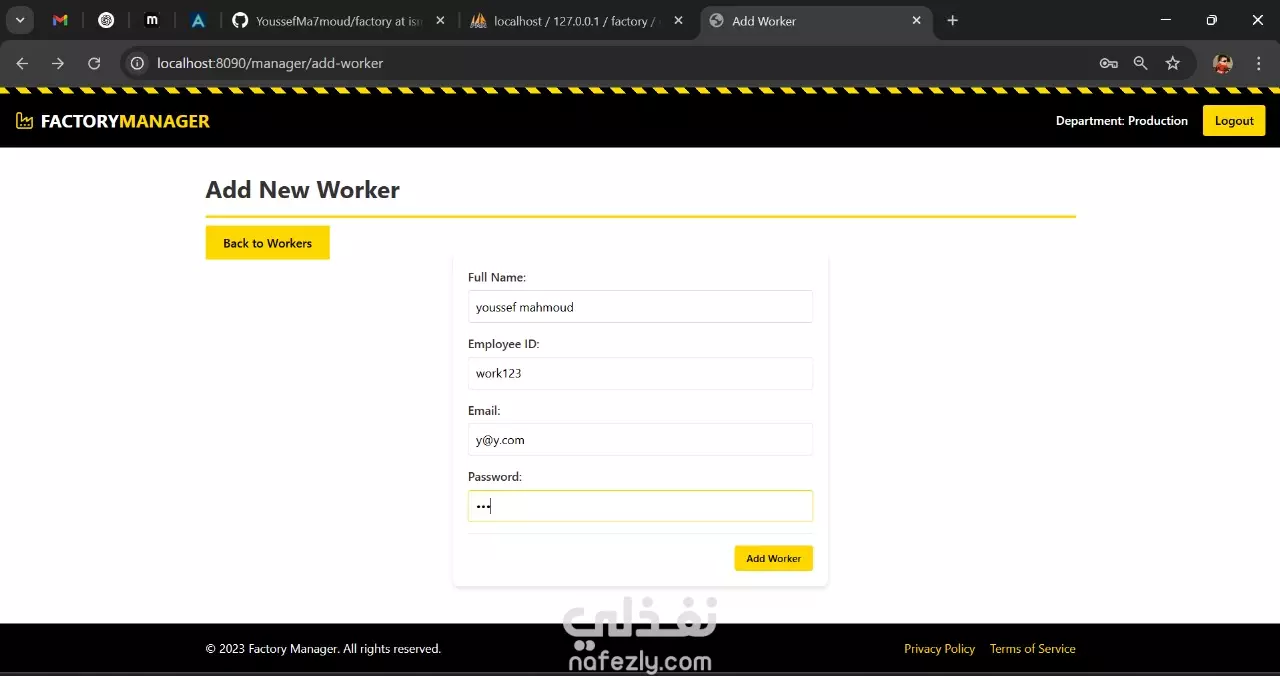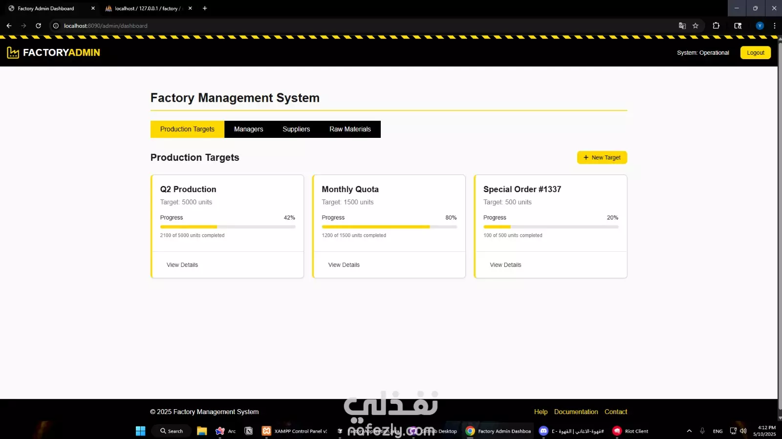 نظام صلاحيات (Role-Based Access Control): لوحات تحكم وصلاحيات مختلفة لكل من المدير (Admin)، المورد (Supplier)، المشرف (Manager)، والعامل (Worker).