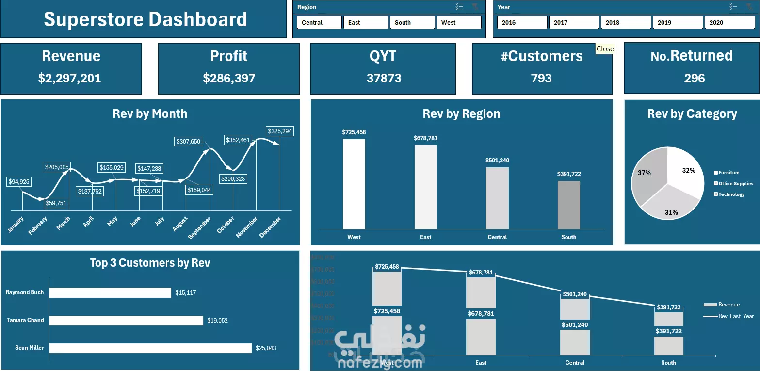 تحليل لوحة معلومات Superstore تُظهر لوحة المعلومات هذه لمحة عامة عن أداء المتجر الكبير عبر مقاييس رئيسية مختلفة، مع التركيز على الإيرادات (Revenue) والأرباح (Profit) وتوزيعها حسب الزمن والمنطقة والفئة. 1. المقاييس الرئيسية الإجمالية (KPIs) الإيرادات (Revenue): $2,297,201 الأرباح (Profit): $286,397 الكمية (QYT - Quantity): 37,873 عدد العملاء (#Customers): 793 عدد المرتجعات (No. Returned): 296 ملاحظة سريعة: نسبة المرتجعات مرتفعة نوعاً ما (296 من أصل 793 عميل على الأقل قاموا بالشراء، مع افتراض أن الـ 793 عميل هم من قاموا بالشراء في الفترة الزمنية المعروضة)، مما قد يشير إلى الحاجة لمراجعة جودة المنتج أو عمليات الشحن. 2. الإيرادات حسب التوزيع أ. الإيرادات حسب الشهر (Rev by Month) يُظهر الرسم البياني الشهري للإيرادات نمطاً واضحاً: بداية هادئة: تبدأ الإيرادات منخفضة في يناير وفبراير. نمو تدريجي: هناك زيادة تدريجية ومستمرة في الربيع والصيف (مارس - أغسطس). الذروة: تصل الإيرادات إلى ذروتها بشكل ملحوظ في نوفمبر ($352,492) وديسمبر ($325,294)، مما يشير إلى أن موسم العطلات هو الأكثر ربحاً. أدنى نقطة: فبراير ($59,751) هو الشهر الأضعف. ب. الإيرادات حسب المنطقة (Rev by Region) تظهر توزيع الإيرادات تباينات كبيرة بين المناطق: الغرب (West): $725,458 (الأعلى) الشرق (East): $678,781 (الثاني) الوسط (Central): $501,240 الجنوب (South): $391,722 (الأقل) التحليل: المنطقة الغربية والشرقية هما القوتان الدافعتان الرئيسيتان للإيرادات، وتشكلان الغالبية العظمى. تحتاج المناطق الوسطى والجنوبية إلى تحليل إضافي لمعرفة سبب انخفاض الأداء مقارنةً بالغرب والشرق. ج. الإيرادات حسب الفئة (Rev by Category) توزيع الإيرادات متوازن نسبياً بين الفئات الثلاث: الأثاث (Furniture): 32% اللوازم المكتبية (Office Supplies): 37% (الأعلى) التقنية (Technology): 31% (الأدنى) التحليل: فئة اللوازم المكتبية هي الأفضل من حيث الإيرادات، تليها الأثاث ثم التقنية. هذا التوازن الجيد في الإيرادات يدل على تنوع صحي في قاعدة المنتجات. 3. أفضل 3 عملاء حسب الإيرادات (Top 3 Customers by Rev) تُظهر هذه القائمة أهم العملاء المساهمين في الإيرادات: Sean Miller: $25,843 Tamara Chand: $19,052 Raymond Buch: $15,117 التحليل: Sean Miller هو العميل الأكثر قيمة بشكل واضح. يجب على المتجر التركيز على برامج الولاء والاحتفاظ بهؤلاء العملاء ذوي القيمة العالية (VIP). الملخص والاستنتاجات الرئيسية الأداء العام: المتجر يحقق إيرادات جيدة تقترب من 2.3 مليون دولار وأرباحاً تزيد عن 286 ألف دولار. الفرصة الموسمية: يجب استغلال شهري نوفمبر وديسمبر بشكل أكبر، حيث يمثلان فترة الذروة المطلقة. التركيز الجغرافي: يجب الحفاظ على الزخم في منطقتي الغرب والشرق، وبحث أسباب ضعف الأداء في مناطق الوسط والجنوب لزيادة حصتها من الإيرادات. الاحتفاظ بالعملاء: هناك حاجة إلى استراتيجيات للاحتفاظ بالعملاء الكبار مثل Sean Miller، بالإضافة إلى مراجعة سبب ارتفاع عدد المرتجعات. هل ترغب في التعمق في تحليل جزء معين من لوحة المعلومات، مثل الأرباح مقابل الإيرادات في كل منطقة؟