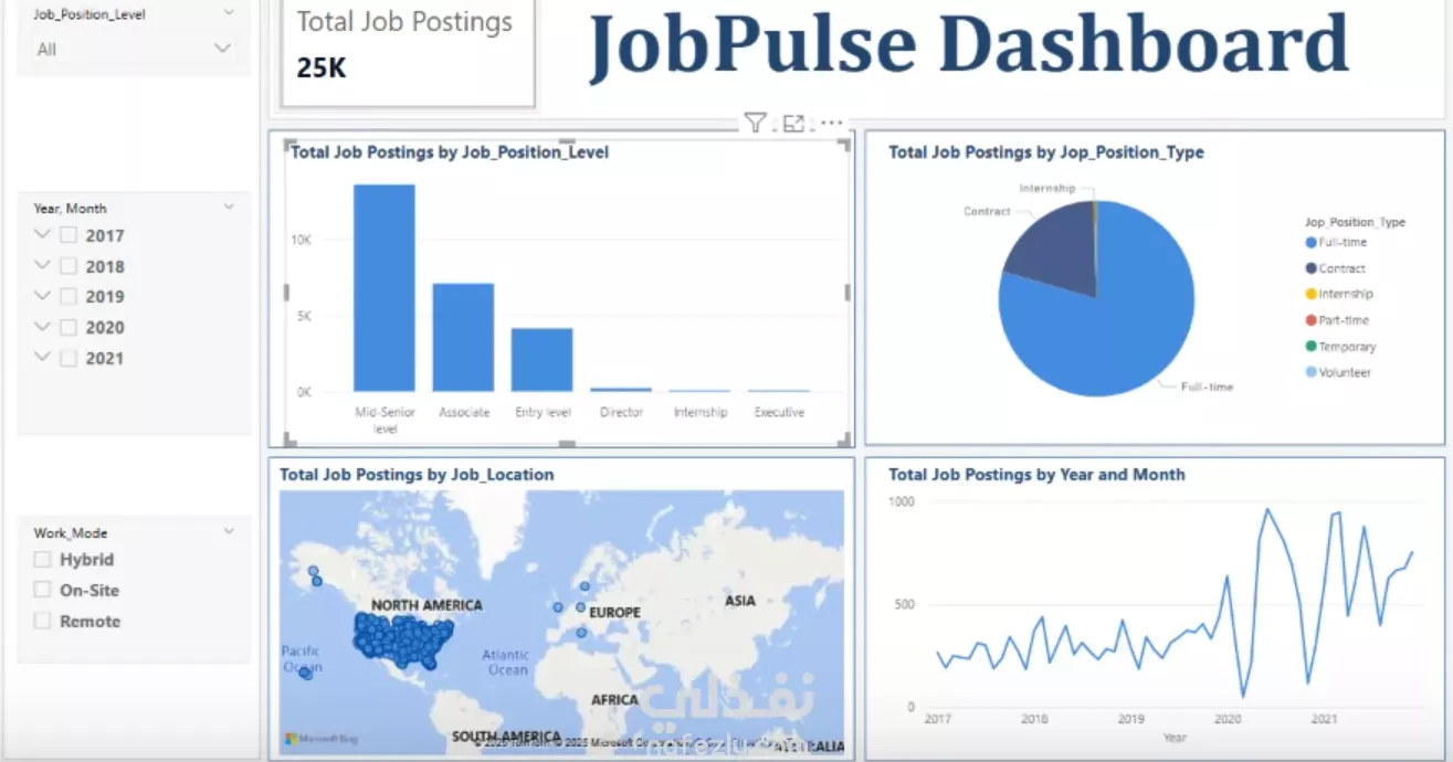 إعداد مقاييس (Measures) باستخدام DAX لحساب مؤشرات الأداء الرئيسية مثل: عدد الوظائف، عدد المتقدمين، متوسط زمن التوظيف، وأكثر الشركات نشاطاً.