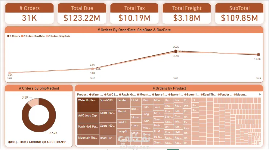 مؤشرات الأداء الرئيسية (KPIs): إجمالي الطلبات، إجمالي المستحق، الضرائب، الشحن، والمجموع الفرعي.