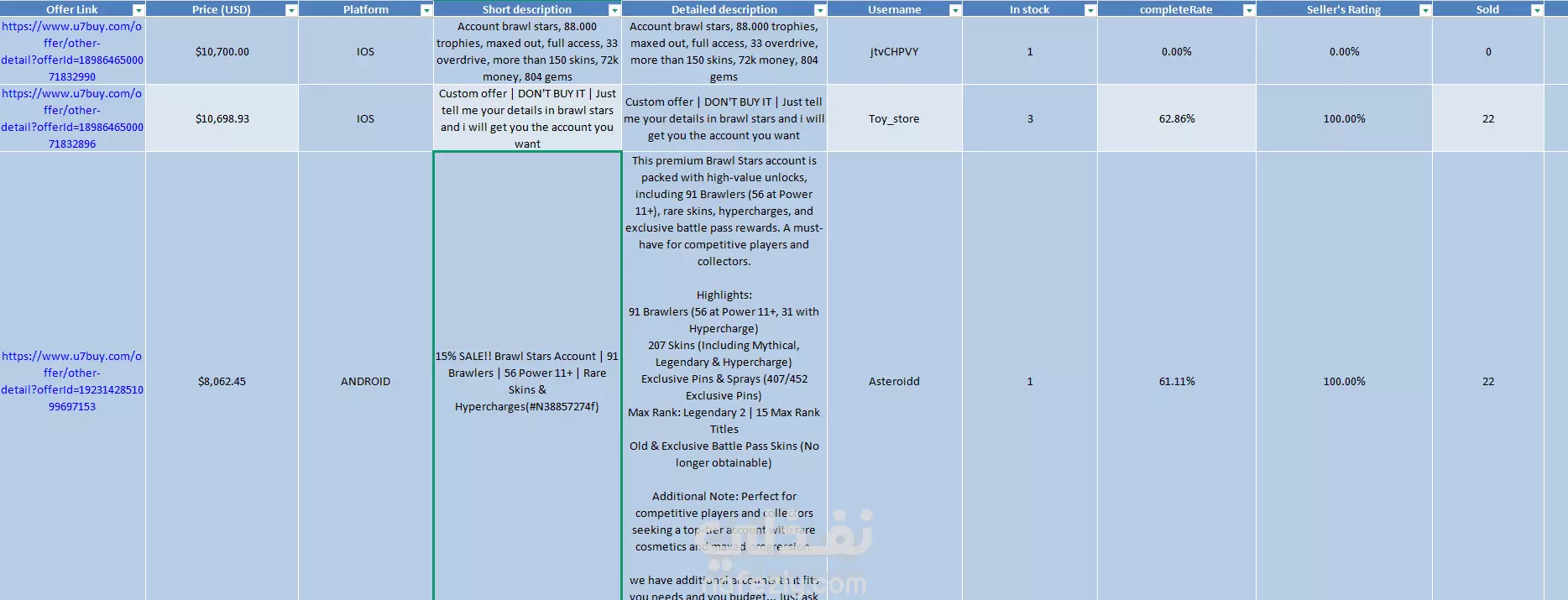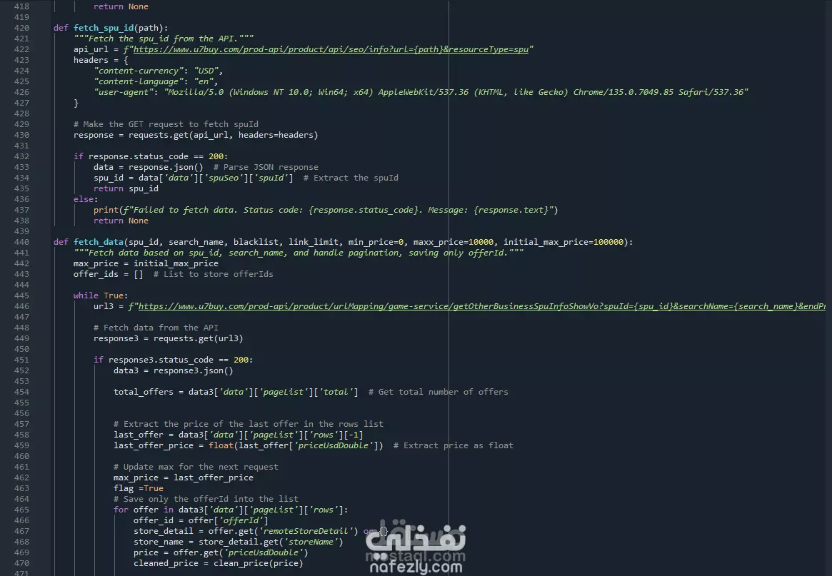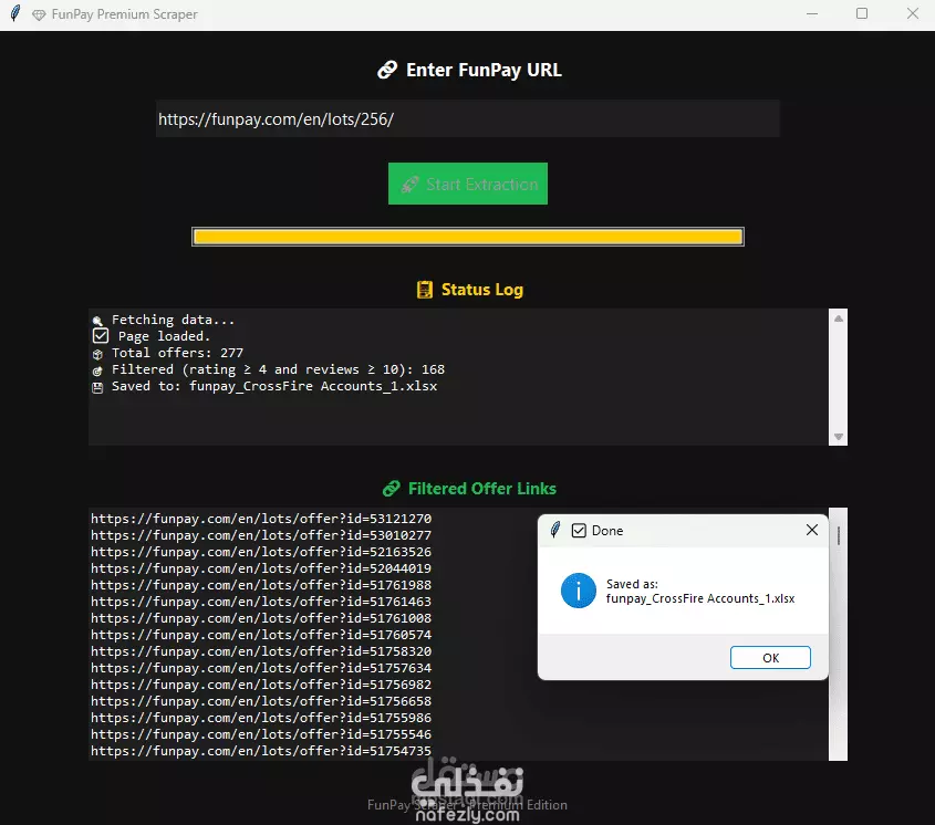 في هذا المشروع قمت بتطوير وتنفيذ نظام Web Scraping احترافي لاستخلاص البيانات تلقائيًا من مواقع التجارة الإلكترونية (مثل: FunPay وU7Buy)، باستخدام أدوات برمجية متقدمة مبنية على Python وواجهات رسومية (GUI) تفاعلية. يتيح هذا النظام: جمع البيانات تلقائيًا من الروابط التي يضعها المستخدم (مثل: صفحات المنتجات أو العروض). استخلاص البيانات التفصيلية مثل: السعر، المنصة، الوصف المختصر والكامل، اسم البائع، التقييمات، عدد المبيعات، وعدد المنتجات المتاحة. تصفية النتائج ديناميكيًا بناءً على تقييم البائع وعدد المراجعات (كما يظهر في الصورة: تم تصفية النتائج إلى عروض ذات تقييم ≥ 4 ومراجعات ≥ 10). التعامل مع المواقع التي تحتوي على Pagination، أي التنقل بين الصفحات آليًا لجمع كل البيانات دون تدخل يدوي. حفظ النتائج مباشرة إلى ملف Excel منسق وجاهز للتحليل، مع تصفية وربط العروض المفلترة (Filtered Offer Links). تصميم واجهة مستخدم GUI تفاعلية باستخدام أدوات مثل Tkinter أو PyQt لتبسيط تجربة الاستخدام، مع زر "Start Extraction" واضح وحالة تنفيذ حية (Status Log). كما أن الكود البرمجي تم تصميمه باحترافية عالية ليشمل: استدعاء واجهات API للمواقع المستهدفة بطريقة مرنة. التحكم في السعر الأدنى والأعلى لتصفية العروض. إدارة الأخطاء في حال فشل الاتصال أو تجاوز الحدود.