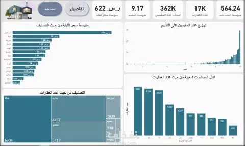 * التصور (Visualization): تم استخدام مخططات متنوعة مثل مخطط الشريط الأفقي لتحليل متوسط سعر الليلة حسب التصنيف، ومخطط الـ Treemap لتوضيح عدد العقارات حسب التصنيف، ومخطط الأعمدة لتحليل المساحات الأكثر شعبية.