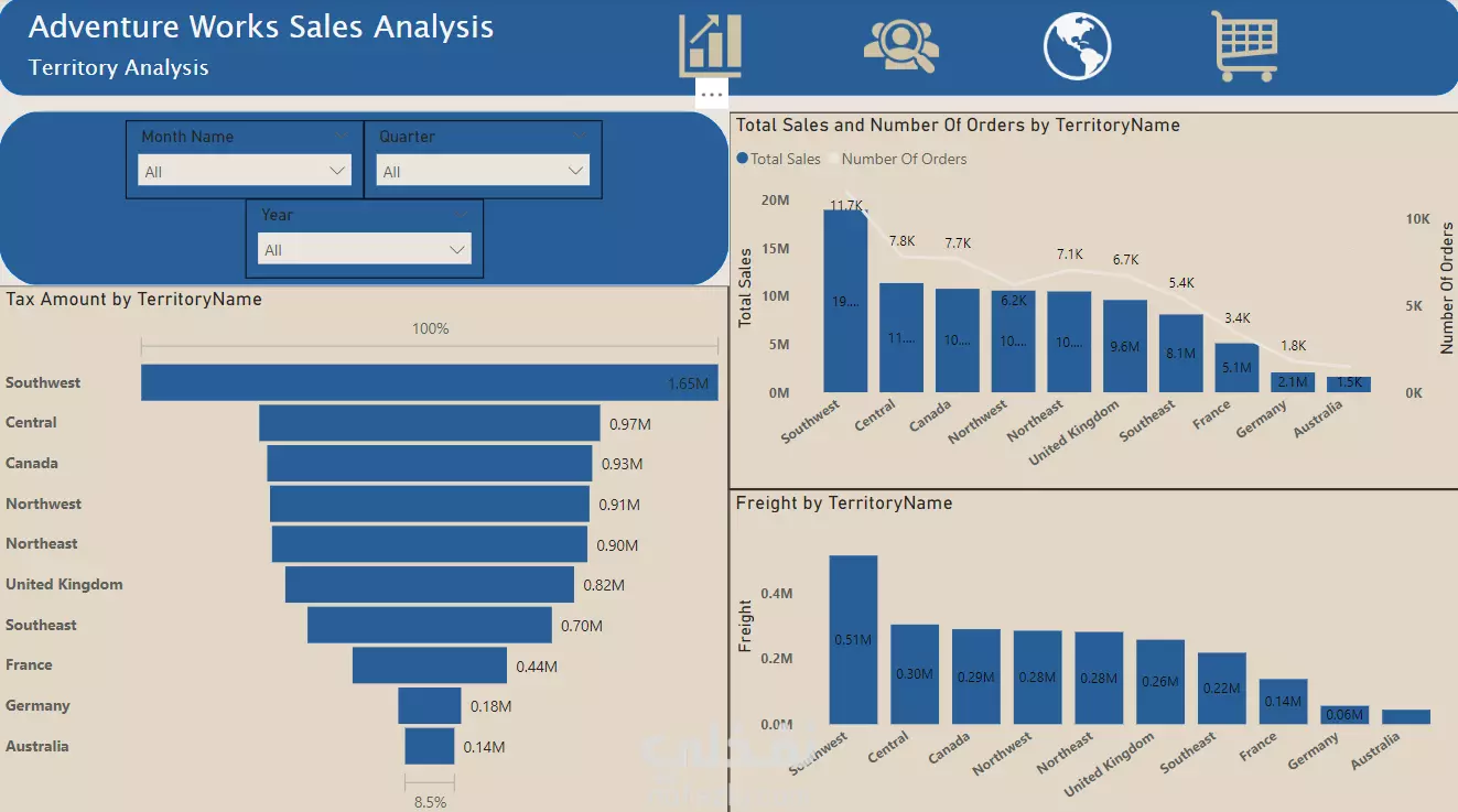 مشروع باستخدام Power BI بهدف إنشاء لوحة معلومات تفاعلية توضح الأداء العام والتشغيلي والمناطقي والمخزوني للشركة. تم تقسيم اللوحة إلى أربع تقارير رئيسية: تقرير الأداء العام: يعرض مؤشرات الأداء الرئيسية (KPIs)، والمبيعات على مدار العام، إضافة إلى بيانات الشحن (Freight) والضرائب حسب وسيلة الشحن، وحالة الطلبات. تقرير العمليات: يتناول أداء مندوبي المبيعات، ويقارن أداء كل مندوب خلال السنة، مع عرض جميع التفاصيل المتعلقة بهم. تحليل المناطق (Territory Analysis): يعرض الضرائب وتكاليف الشحن في كل منطقة، بالإضافة إلى إجمالي المبيعات لكل منطقة. تقرير المخزون: يعرض المنتجات الأعلى مبيعًا من حيث القيمة والكمية، إلى جانب توزيع المبيعات حسب خط الإنتاج وفئة المنتج. تم استخدام شرائح تصفية (Slicers) في كل صفحة لتقسيم السنة، مما يسمح بالتعمق في تفاصيل المبيعات حسب الفترات الزمنية المختلفة.