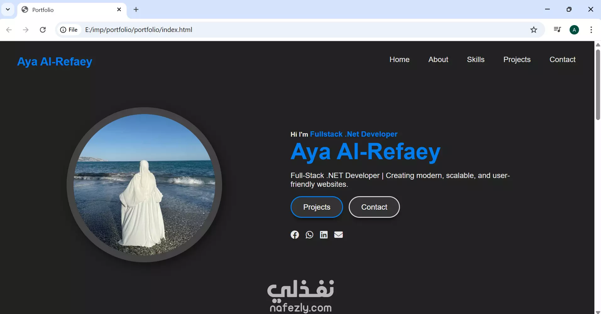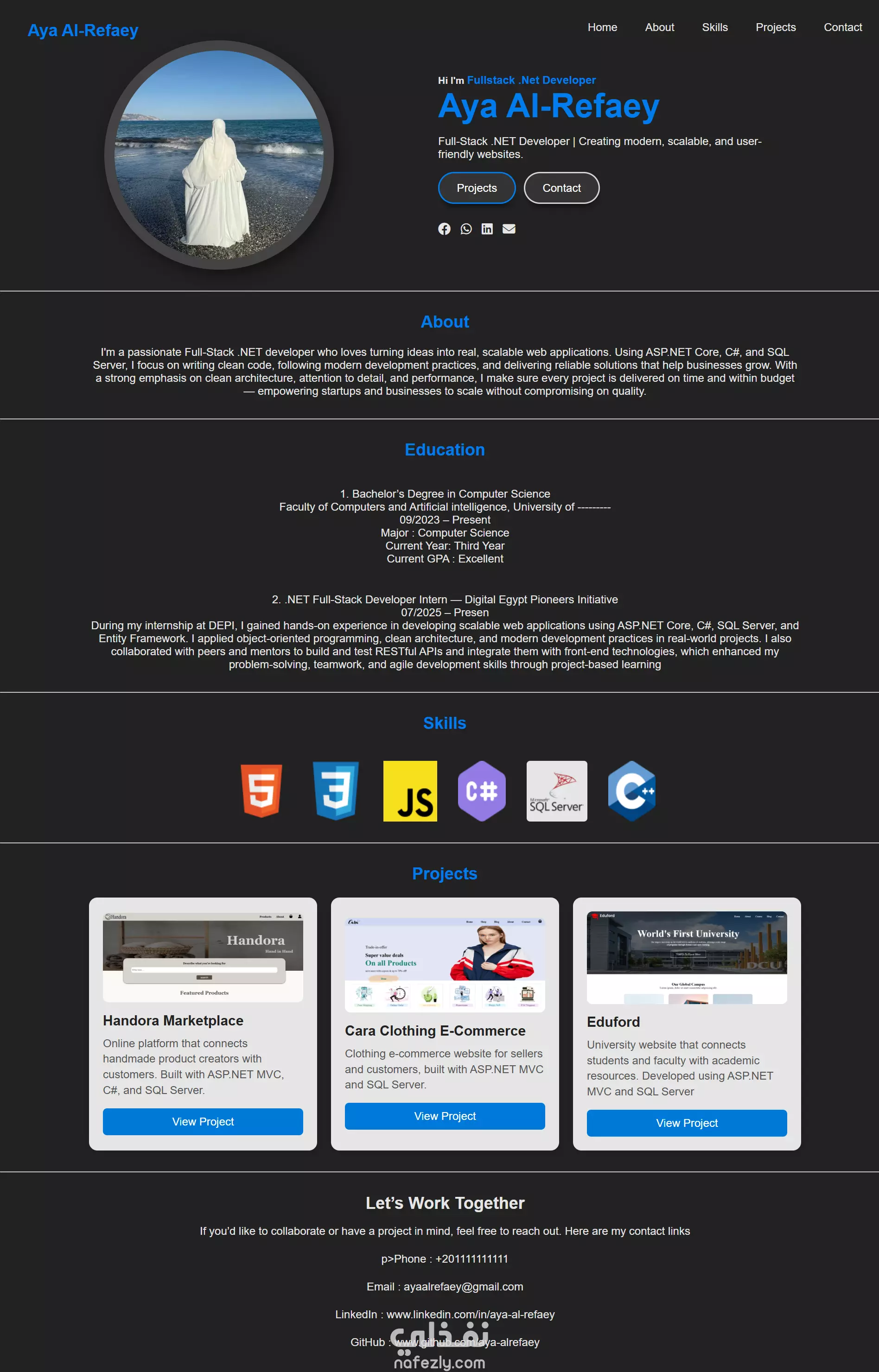 قسم المهارات (Skills): يوضح التقنيات والأدوات اللي أستخدمها.