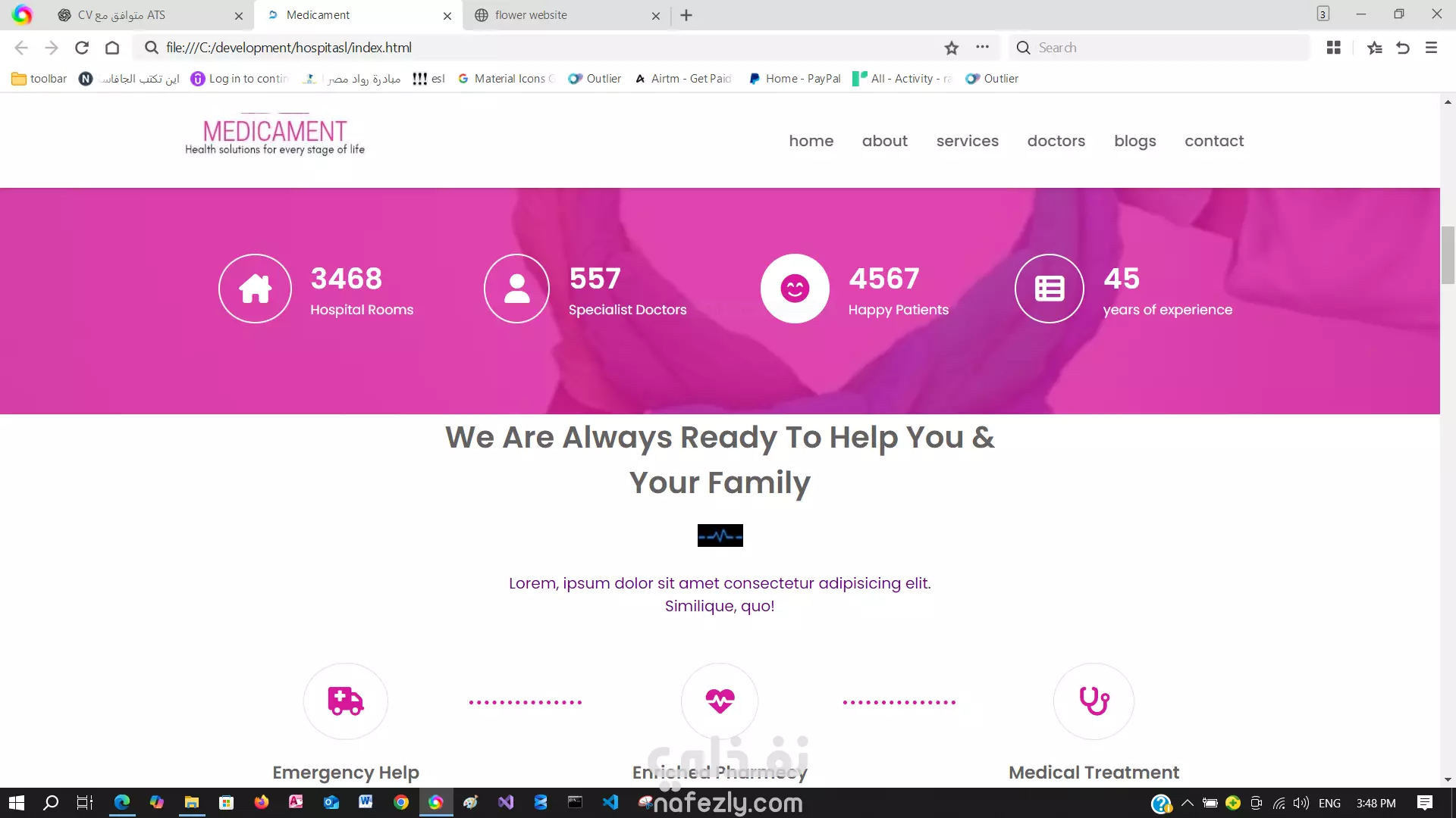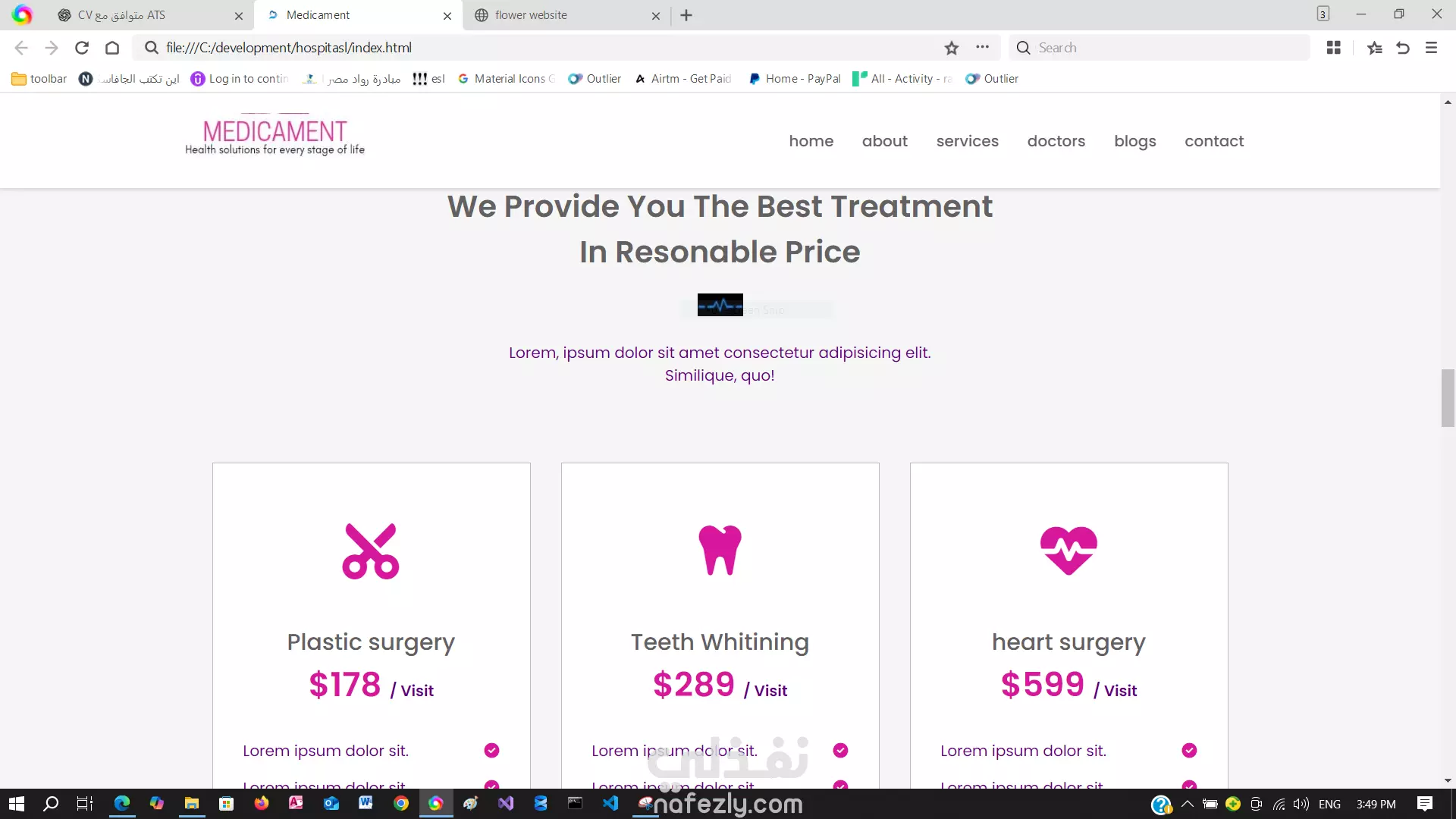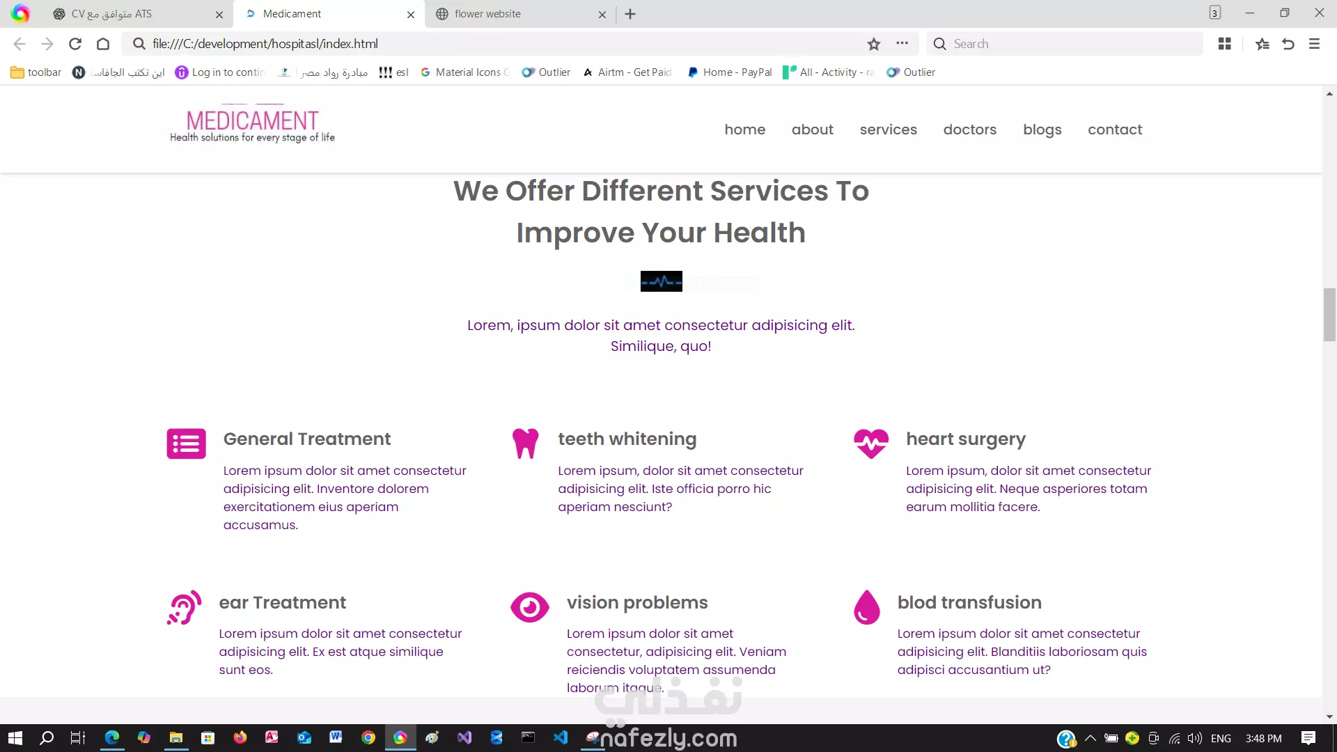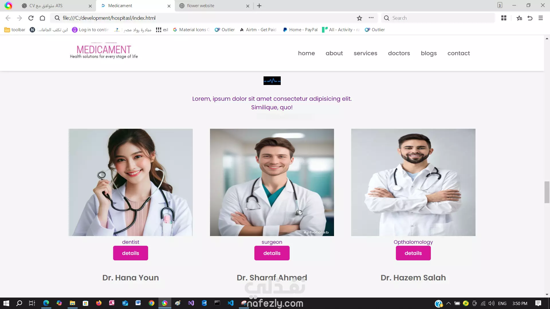 الوصف: تصميم واجهة موقع إلكتروني لمستشفى أو عيادة طبية. الموقع بيعرض الخدمات الطبية المتوفرة، معلومات عن الأطباء، ومكان المستشفى، بطريقة منظمة وسهلة للمستخدم. المميزات: صفحة رئيسية تحتوي على ترحيب بالمستخدم + بانر للمستشفى صفحة تعرض التخصصات الطبية (باطنة، أطفال، نساء وتوليد، ... إلخ) قسم خاص بالأطباء وصورهم وتخصص كل دكتور صفحة لحجز موعد (Form بدون باك اند) تصميم بسيط وجذاب مع استخدام ألوان طبية هادية متجاوب مع الشاشات الصغيرة (Responsive Design)