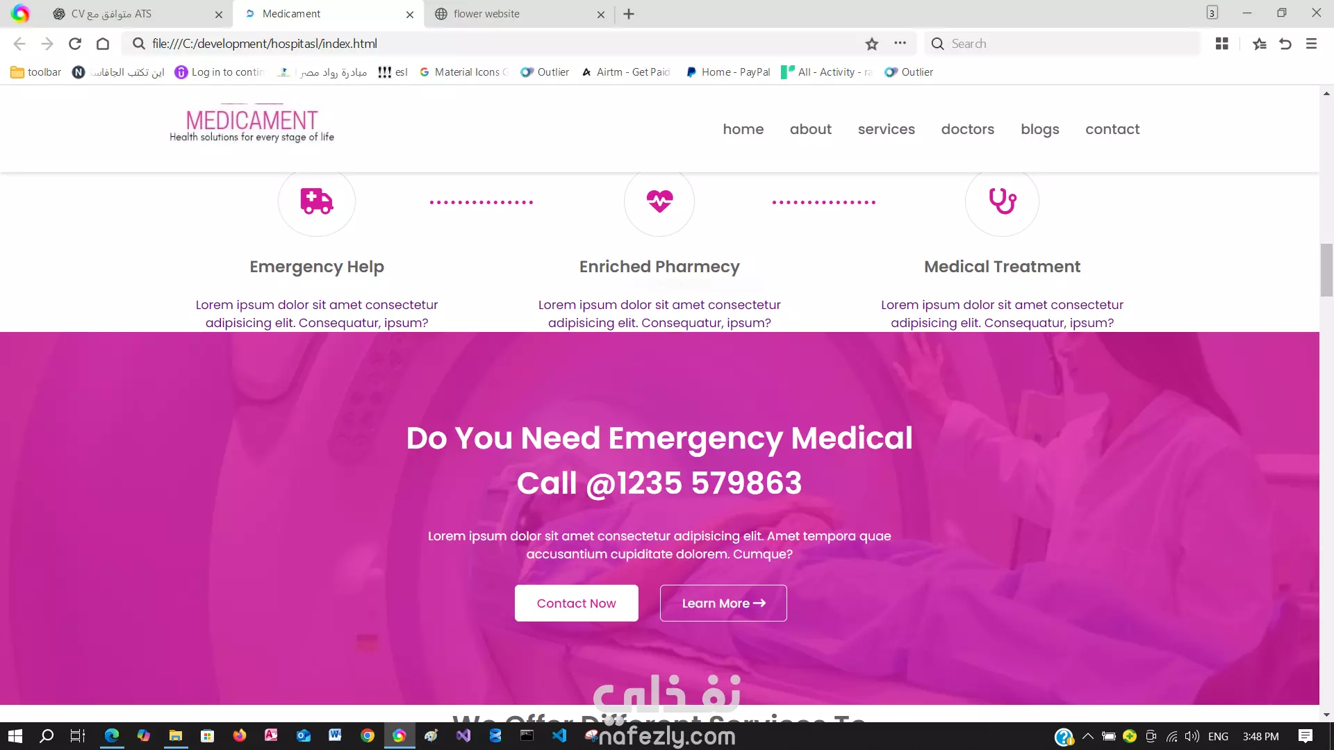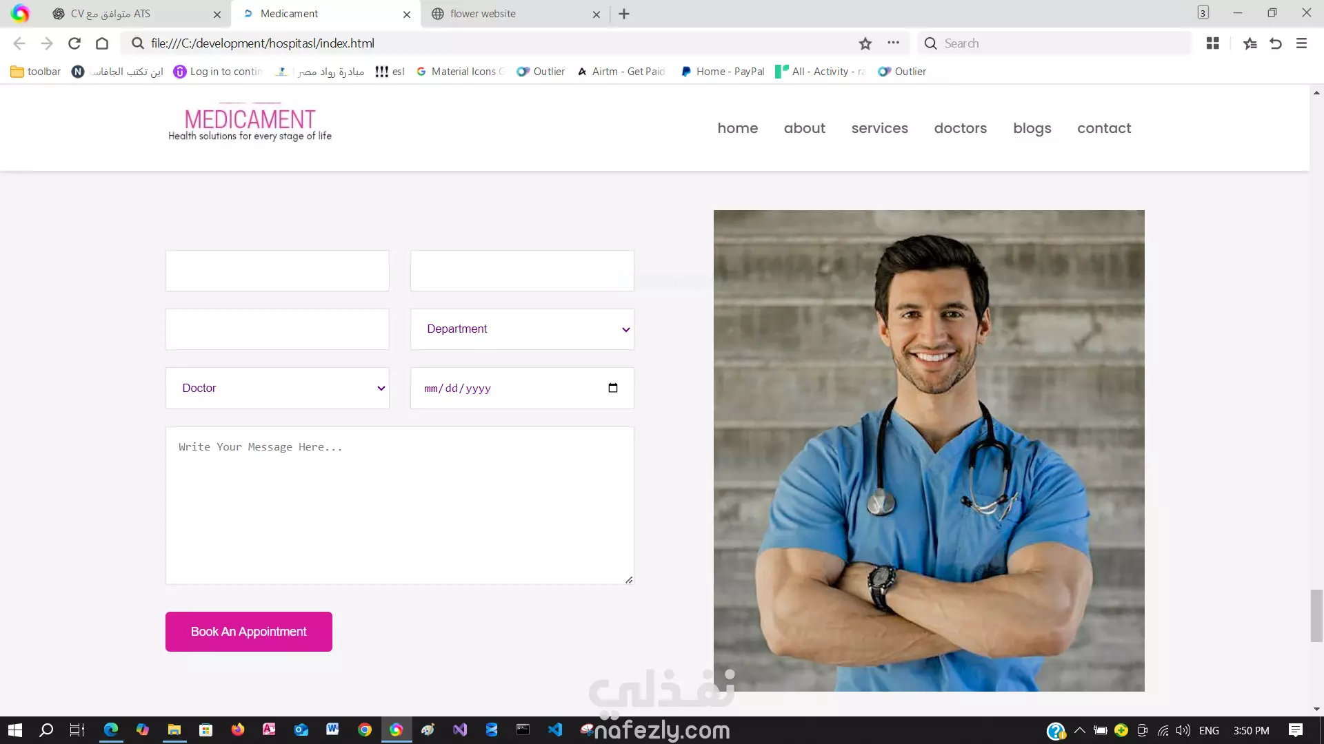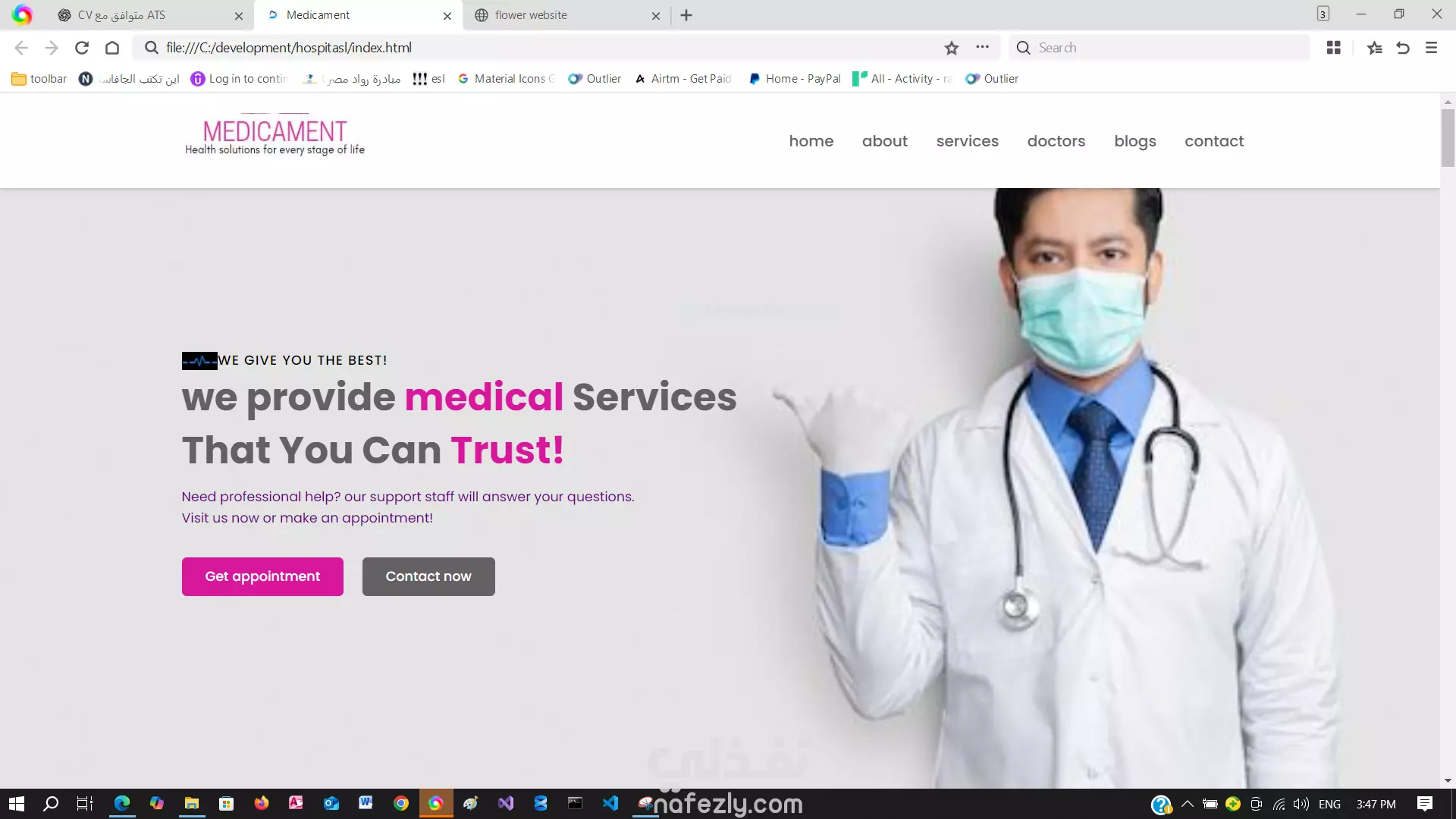 الوصف: تصميم واجهة موقع إلكتروني لمستشفى أو عيادة طبية. الموقع بيعرض الخدمات الطبية المتوفرة، معلومات عن الأطباء، ومكان المستشفى، بطريقة منظمة وسهلة للمستخدم. المميزات: صفحة رئيسية تحتوي على ترحيب بالمستخدم + بانر للمستشفى صفحة تعرض التخصصات الطبية (باطنة، أطفال، نساء وتوليد، ... إلخ) قسم خاص بالأطباء وصورهم وتخصص كل دكتور صفحة لحجز موعد (Form بدون باك اند) تصميم بسيط وجذاب مع استخدام ألوان طبية هادية متجاوب مع الشاشات الصغيرة (Responsive Design)