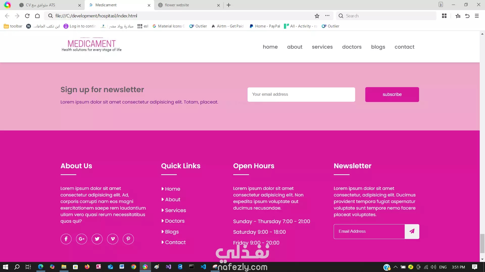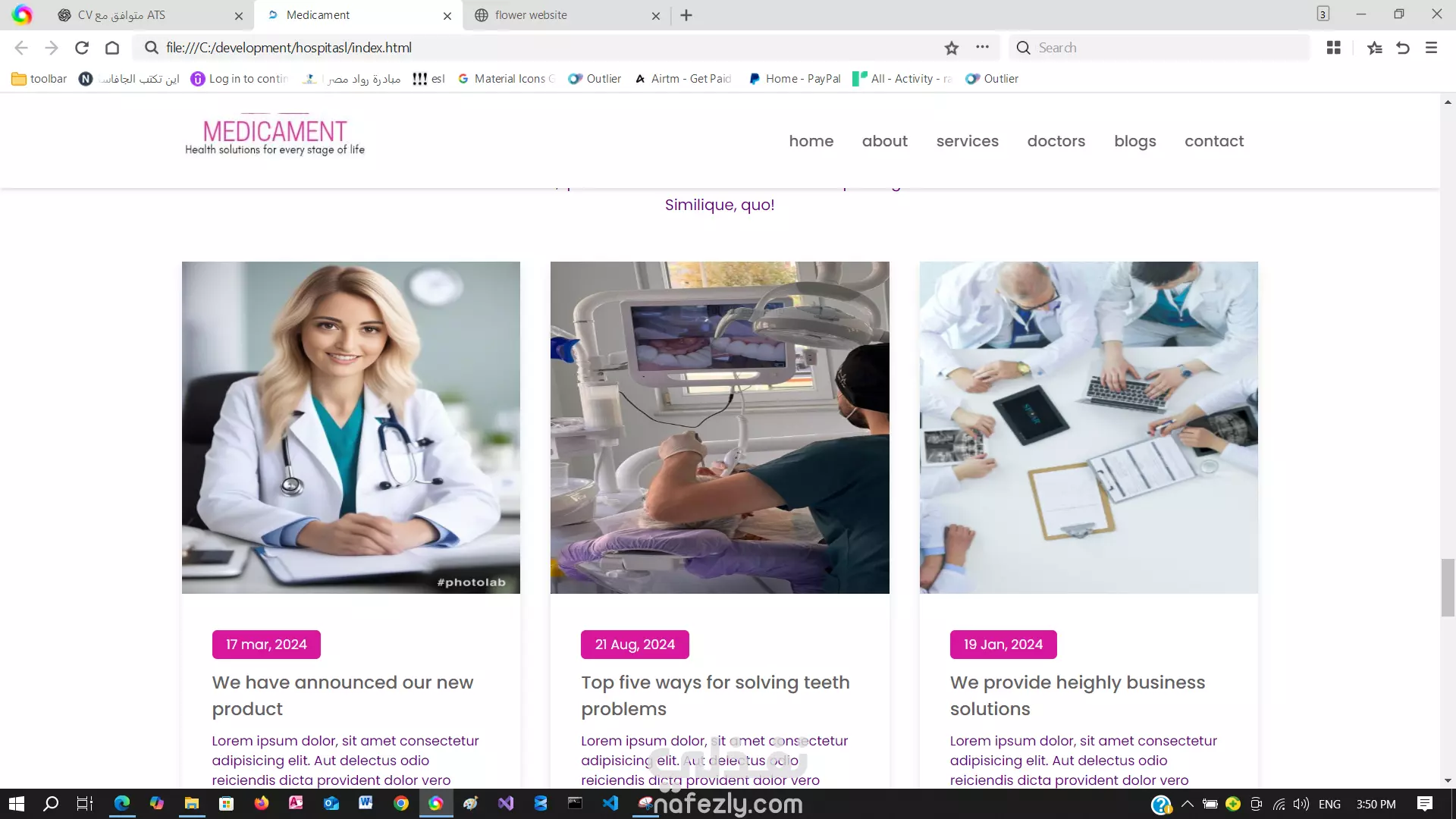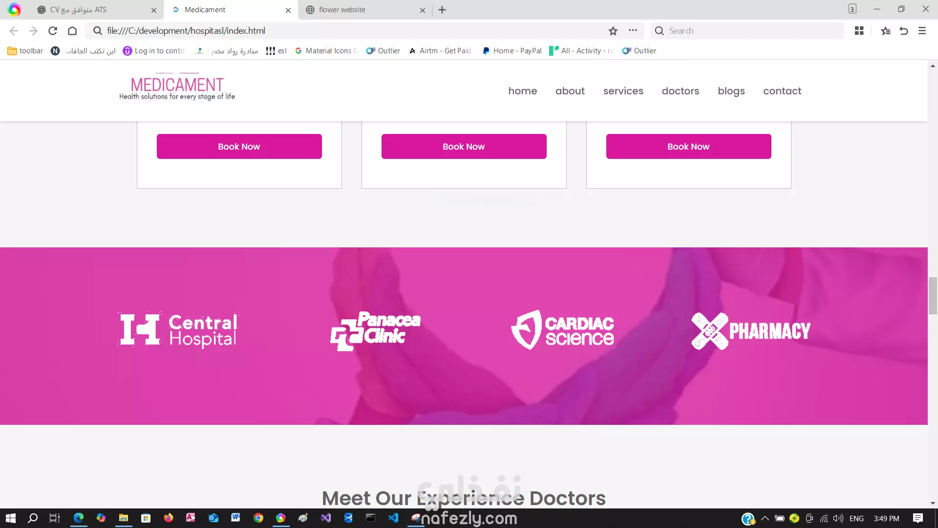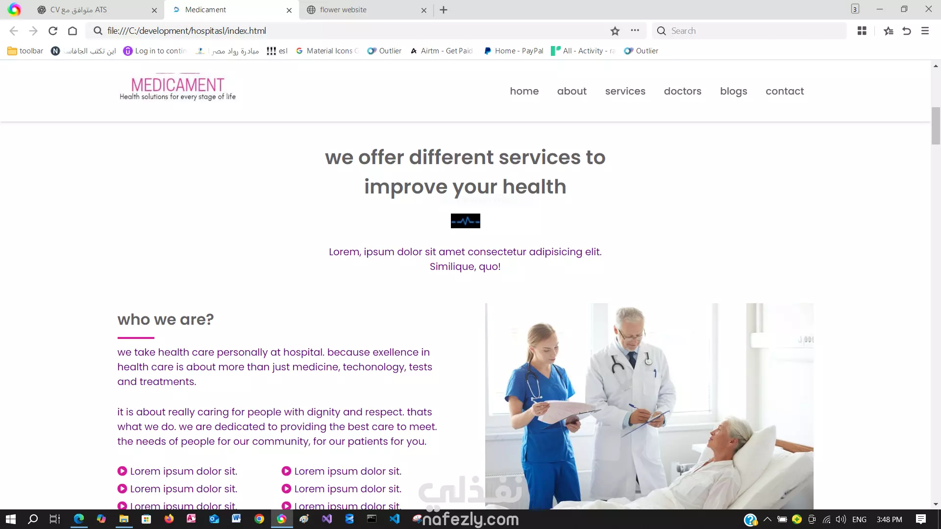 الوصف: تصميم واجهة موقع إلكتروني لمستشفى أو عيادة طبية. الموقع بيعرض الخدمات الطبية المتوفرة، معلومات عن الأطباء، ومكان المستشفى، بطريقة منظمة وسهلة للمستخدم. المميزات: صفحة رئيسية تحتوي على ترحيب بالمستخدم + بانر للمستشفى صفحة تعرض التخصصات الطبية (باطنة، أطفال، نساء وتوليد، ... إلخ) قسم خاص بالأطباء وصورهم وتخصص كل دكتور صفحة لحجز موعد (Form بدون باك اند) تصميم بسيط وجذاب مع استخدام ألوان طبية هادية متجاوب مع الشاشات الصغيرة (Responsive Design)