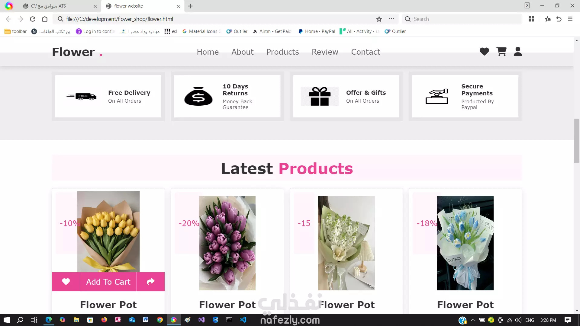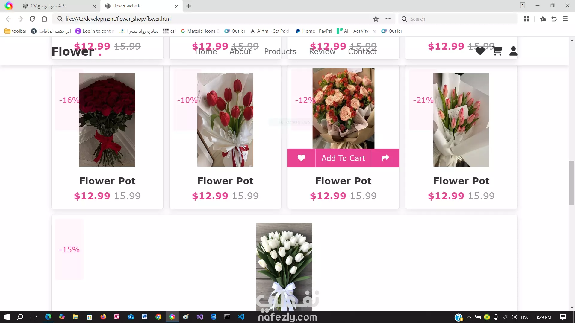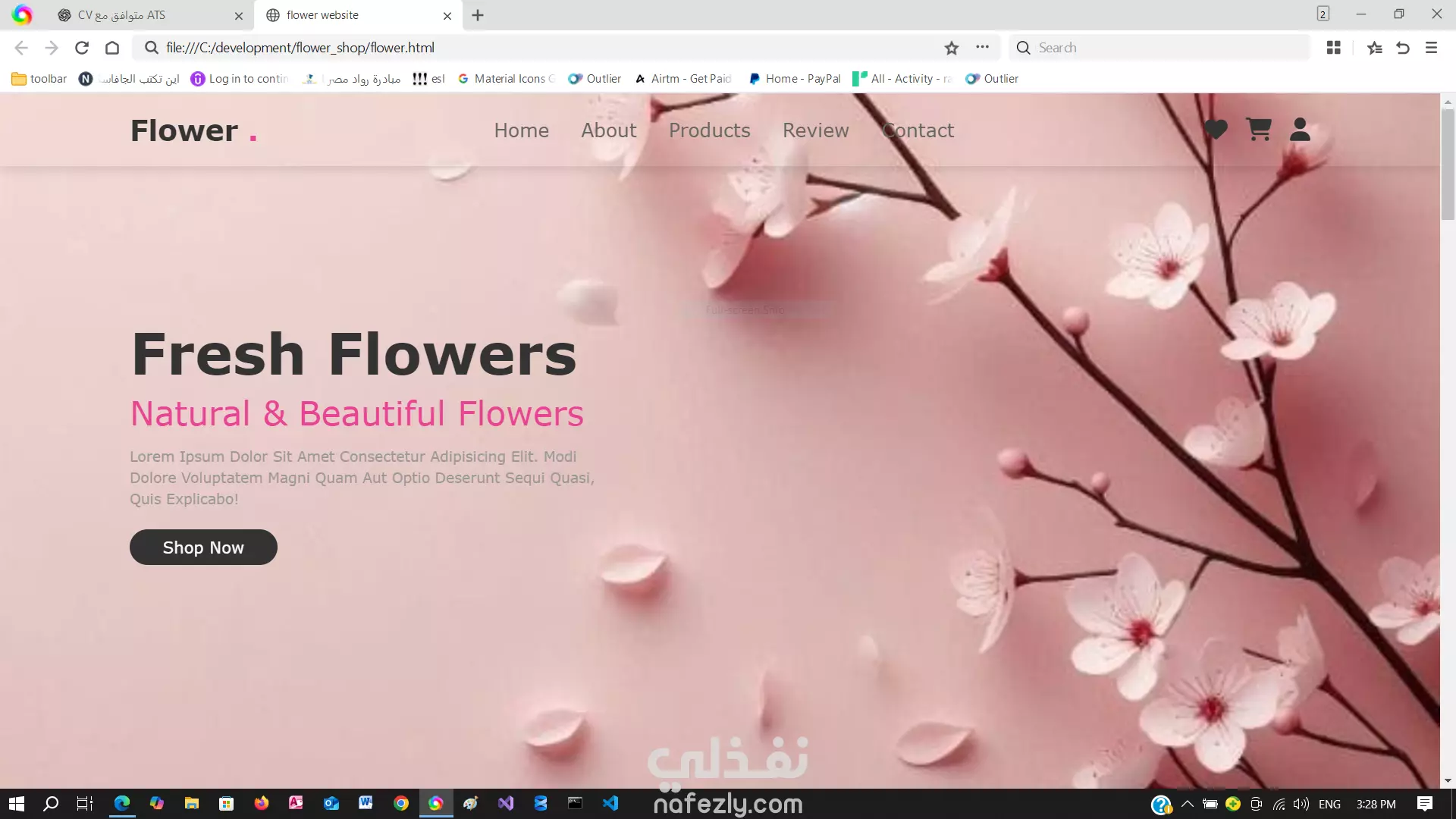 لوصف: مشروع واجهة مستخدم (Frontend) لموقع محل ورد. التصميم يعرض المنتجات، مع تنسيق جذاب وألوان هادئة تناسب طبيعة المشروع. الموقع مكوّن من عدة صفحات ثابتة. المميزات: صفحة رئيسية تحتوي على بانر ترحيبي وعروض صفحة لعرض منتجات الورود بأنواعها (بوكيهات – ورد مفرد – هدايا) تصميم سلة مشتريات وهمية (للعرض فقط) نموذج تواصل للطلب أو الاستفسار تصميم متجاوب نسبيًا مع الشاشات المختلفة (Responsive)