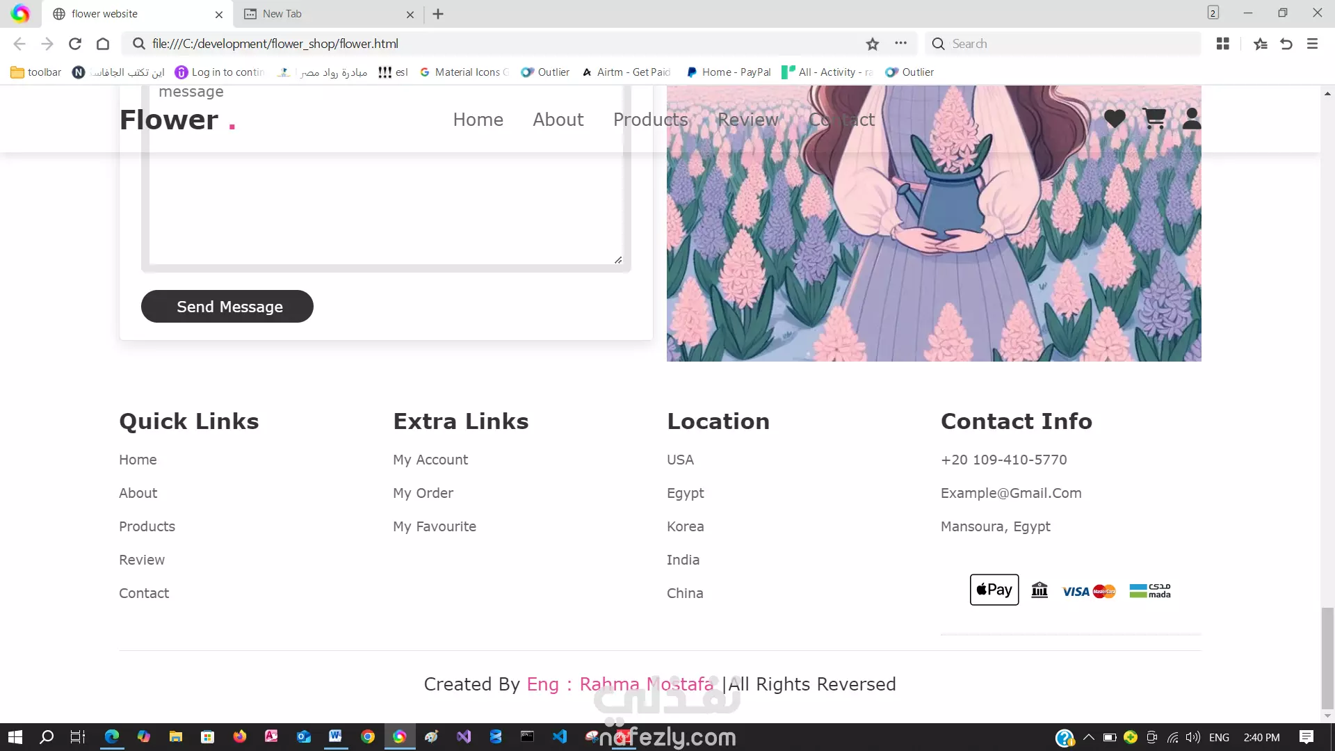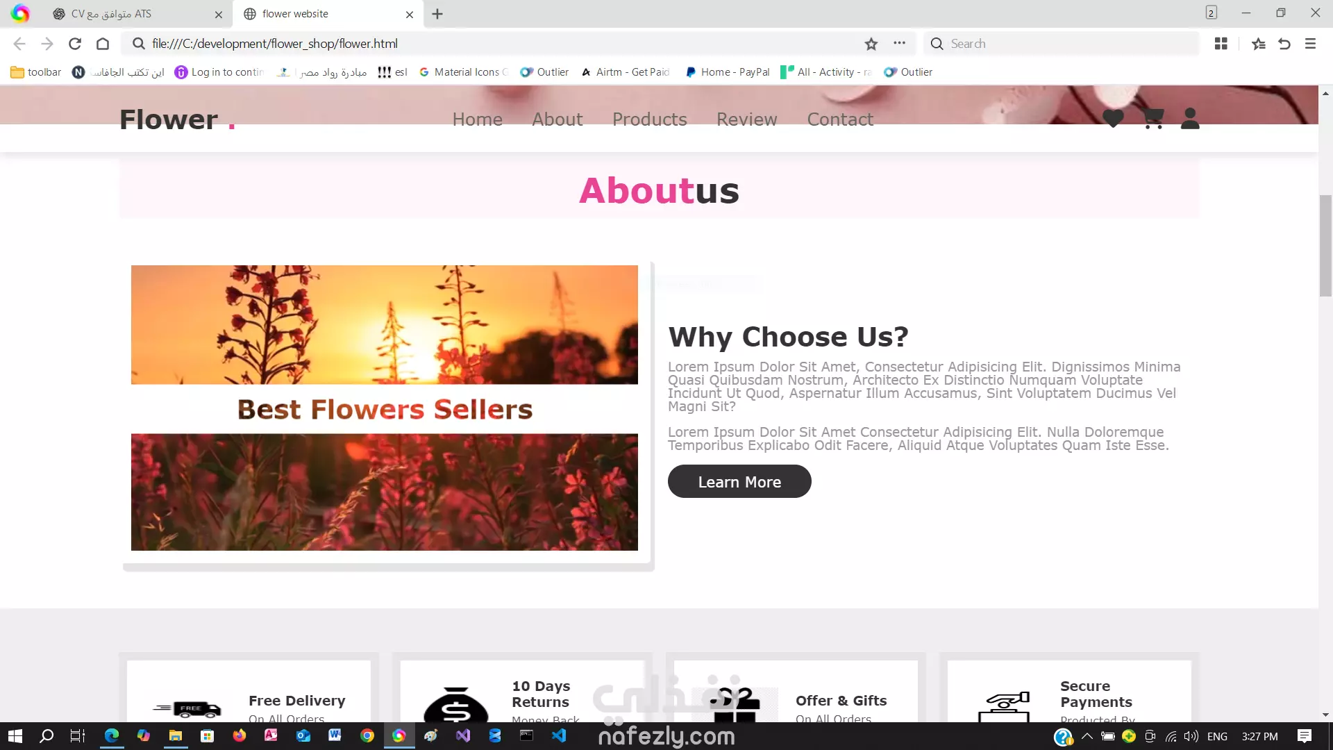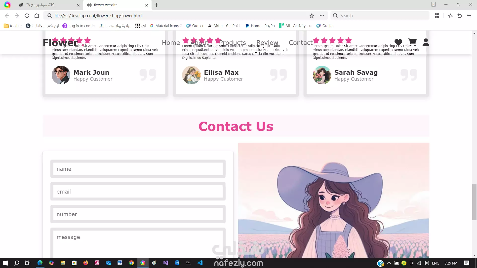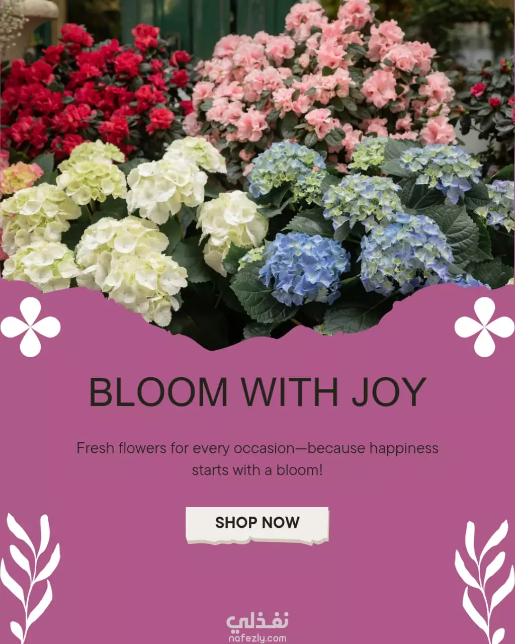 لوصف: مشروع واجهة مستخدم (Frontend) لموقع محل ورد. التصميم يعرض المنتجات، مع تنسيق جذاب وألوان هادئة تناسب طبيعة المشروع. الموقع مكوّن من عدة صفحات ثابتة. المميزات: صفحة رئيسية تحتوي على بانر ترحيبي وعروض صفحة لعرض منتجات الورود بأنواعها (بوكيهات – ورد مفرد – هدايا) تصميم سلة مشتريات وهمية (للعرض فقط) نموذج تواصل للطلب أو الاستفسار تصميم متجاوب نسبيًا مع الشاشات المختلفة (Responsive)
