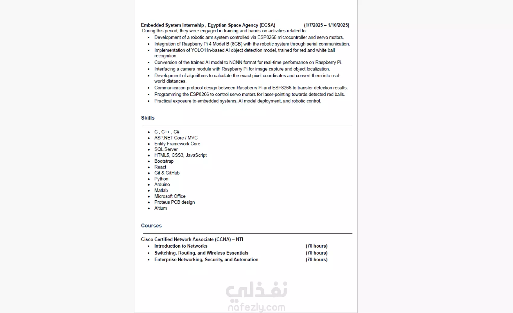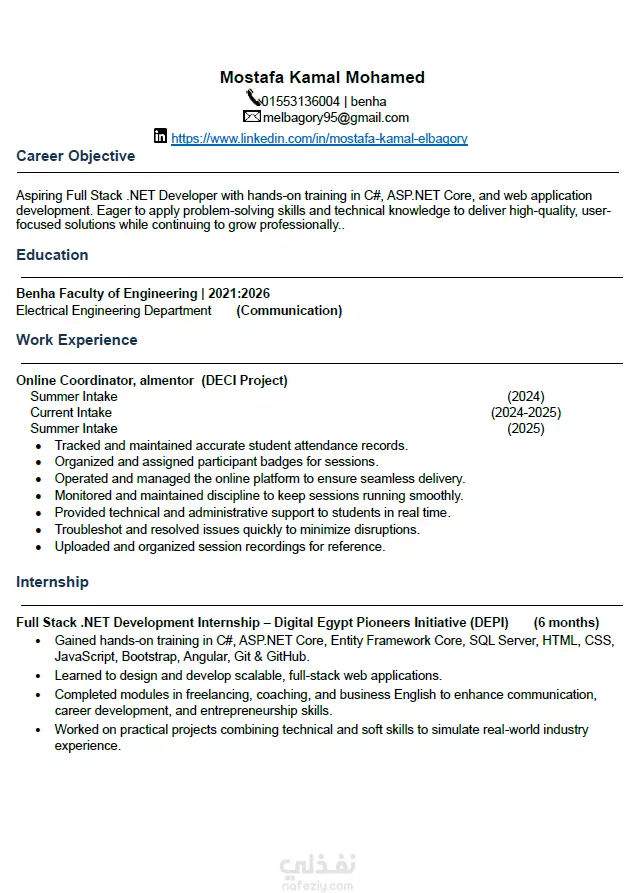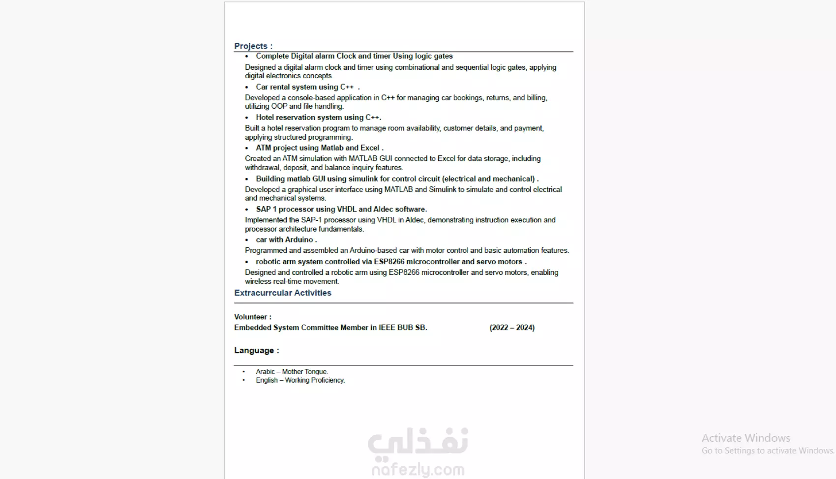 هل بتدور على سيرة ذاتية قوية واحترافية تميزك وسط المتقدمين للوظائف؟ أنا هصمملك CV بالعربي أو الإنجليزي (أو الاثنين معًا) متوافق مع نظام ATS، علشان يضمن إنه يوصل لمسؤول التوظيف من غير ما يتم استبعاده في الفحص الآلي. مميزات الخدمة: تصميم سيرة ذاتية احترافية ومنظمة تناسب مجالك الوظيفي. إدراج الكلمات المفتاحية المناسبة لضمان اجتياز ATS. صياغة لغوية قوية خالية من الأخطاء. التسليم بصيغ متعددة (PDF + Word). إمكانية إضافة Cover Letter داعم (اختياري). تعديلات مفتوحة لحد ما تكون راضي تمامًا. معايا هتضمن إن سيرتك الذاتية مش بس شكلها أنيق، لكن كمان مبنية صح وتزود فرص قبولك في المقابلات.