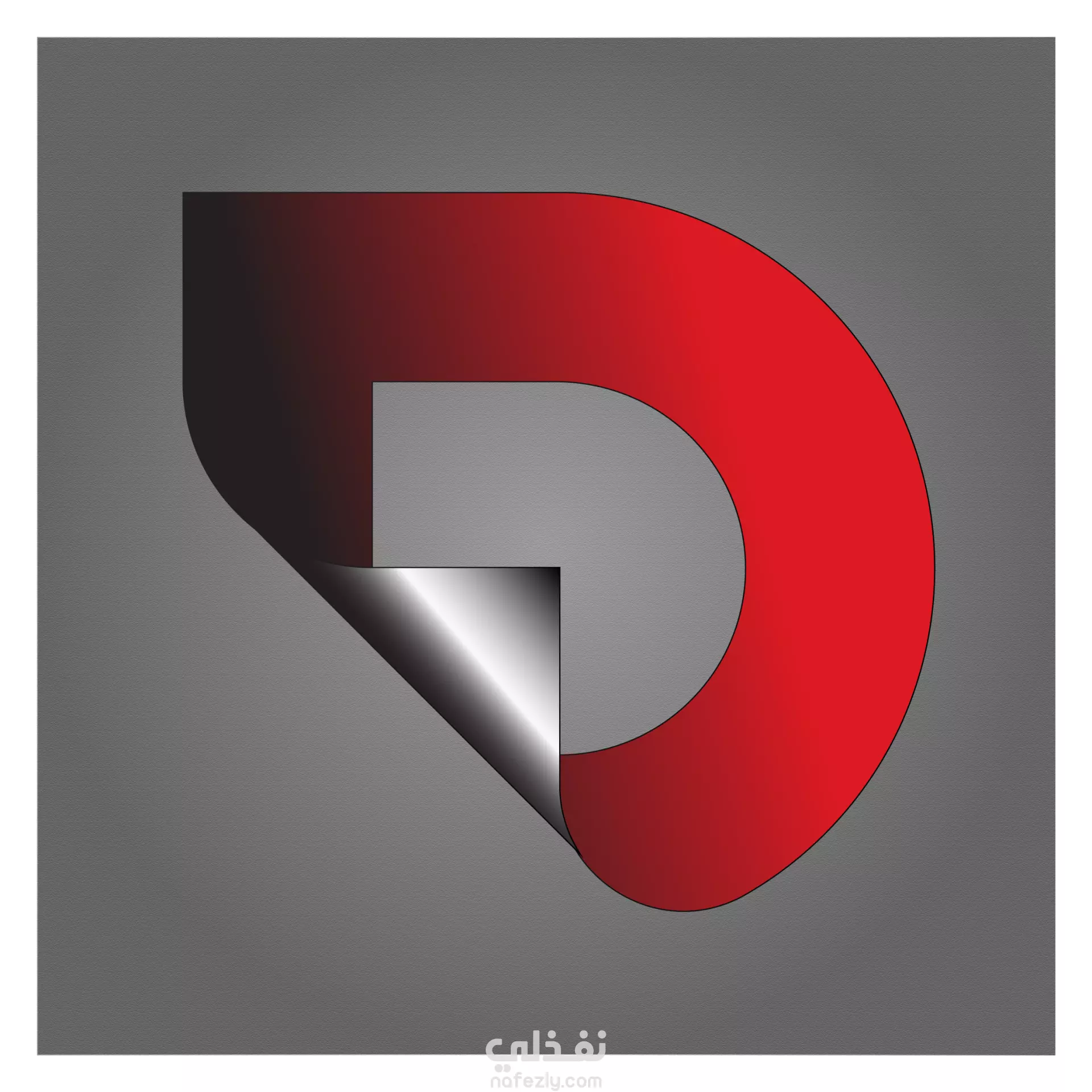 شعار بحرف D بتأثير الطي المعدني وتدرجات الأحمر، يعكس الاحترافية والحركة.