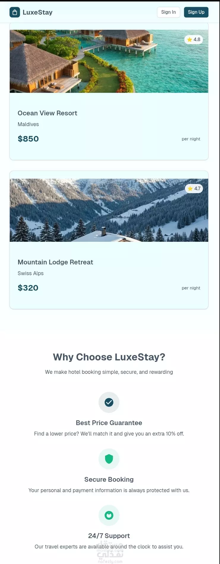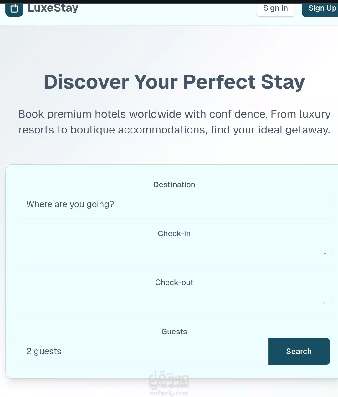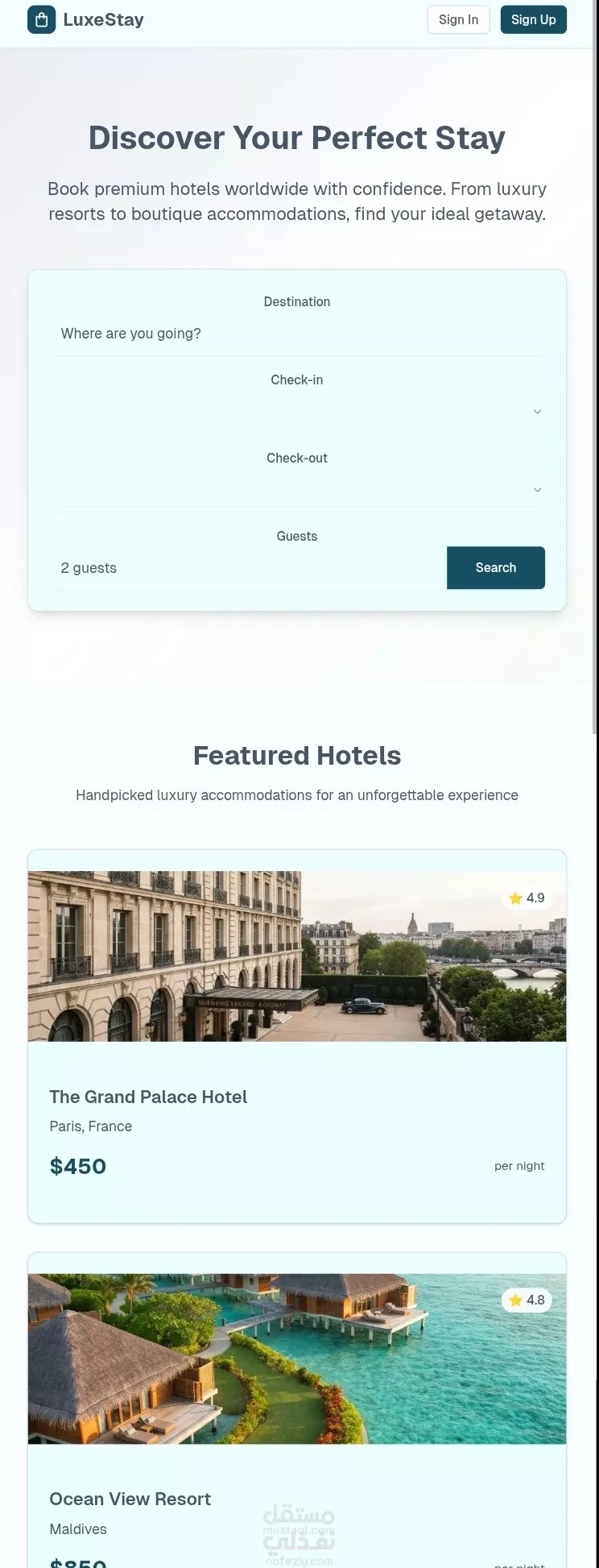 منصة ويب لحجز الفنادق تتيح للمستخدمين تصفح الفنادق حسب الموقع والتاريخ وعدد النزلاء، مع عرض تفاصيل كل فندق (الصور، السعر، التقييم، الخدمات المتاحة)، وإمكانية الحجز والدفع أونلاين. المنصة تحتوي على لوحة تحكم للإدارة لإدارة الفنادق والحجوزات والمستخدمين، وتدعم تسجيل الدخول والتسجيل، وتعمل بشكل سريع ومتجاوب على جميع الأجهزة