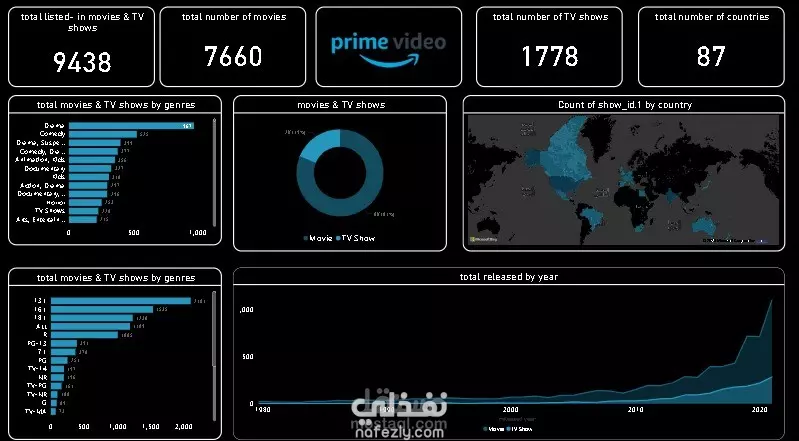 تم تطوير لوحة معلومات تفاعلية باستخدام Power BI لتحليل مكتبة محتوى منصة Amazon Prime Video، بهدف فهم توزيع الأعمال (أفلام ومسلسلات) حسب النوع، البلد، السنة، والتصنيفات العمرية، مع توفير مؤشرات لمساعدة في اتخاذ قرارات تسويقية وإنتاجية.