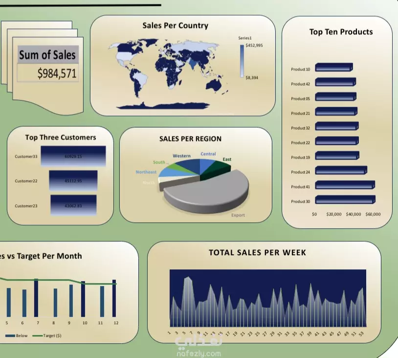 التوزيع الجغرافي للمبيعات: خريطة عالم تفاعلية توضح حجم المبيعات في كل دولة، مما يساعد على تحديد الأسواق الرئيسية والواعدة.