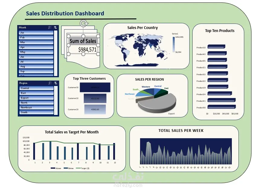 تم تصميم لوحة بيانات (Dashboard) تحليلية متكاملة لتوفير رؤية شاملة وعميقة حول أداء وتوزيع المبيعات. تم بناء هذه اللوحة لمساعدة مديري المبيعات وصناع القرار على فهم مصادر الإيرادات بشكل دقيق، وتحديد أهم المنتجات والعملاء، ومراقبة الأداء مقارنة بالأهداف المحددة.