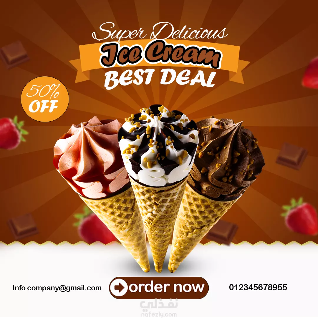 لتركيز البصري: يتركز التصميم على ثلاثة أقماع آيس كريم بنكهات مختلفة (شوكولاتة، فانيليا/مكسرات، وفراولة/نكهة حمراء)، والتي تظهر بجودة عالية وبشكل شهي (Food Photography focus). لوحة الألوان: تم اختيار لوحة ألوان دافئة ومغرية تهيمن عليها درجات البني والبرتقالي الداكن (لون الشوكولاتة والكراميل)، مما يعزز شهية المشاهد. كما تم استخدام خلفية متوهجة لإبراز المنتج. العرض الترويجي: إبراز قوي للعرض التنافسي بوضع دائرة '50% OFF' بشكل واضح وجذاب في الزاوية اليسرى. الرسالة النصية: استخدام خطوط جريئة ومميزة لعبارات رئيسية مثل 'Super Delicious' و 'BEST DEAL' مع اسم المنتج 'Ice Cream' لضمان قراءة الرسالة بسرعة. الدعوة للعمل (CTA): تضمين زر واضح 'Order Now' مع معلومات الاتصال (بريد إلكتروني ورقم هاتف) لتسهيل عملية الشراء الفورية.