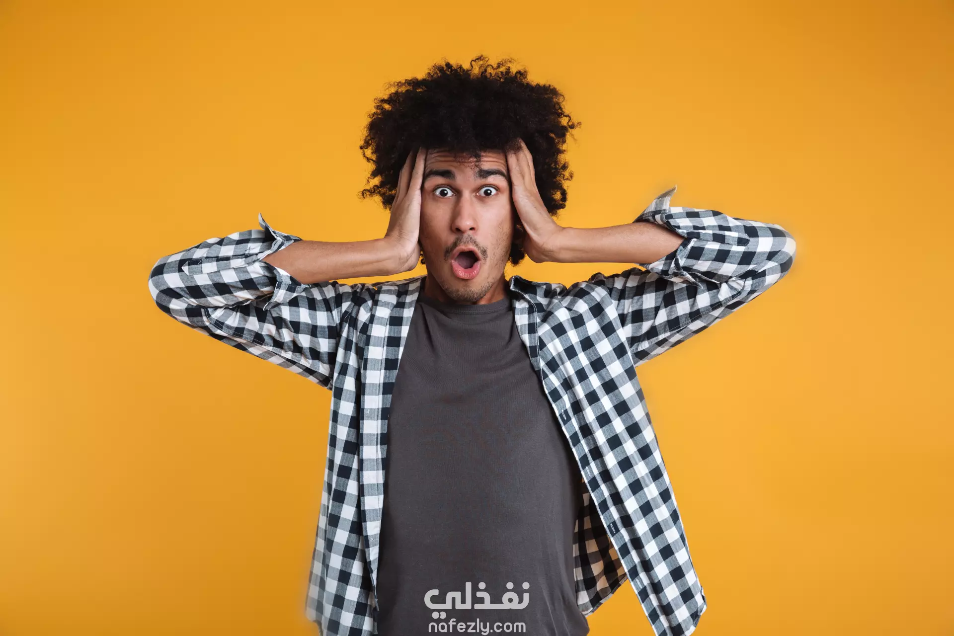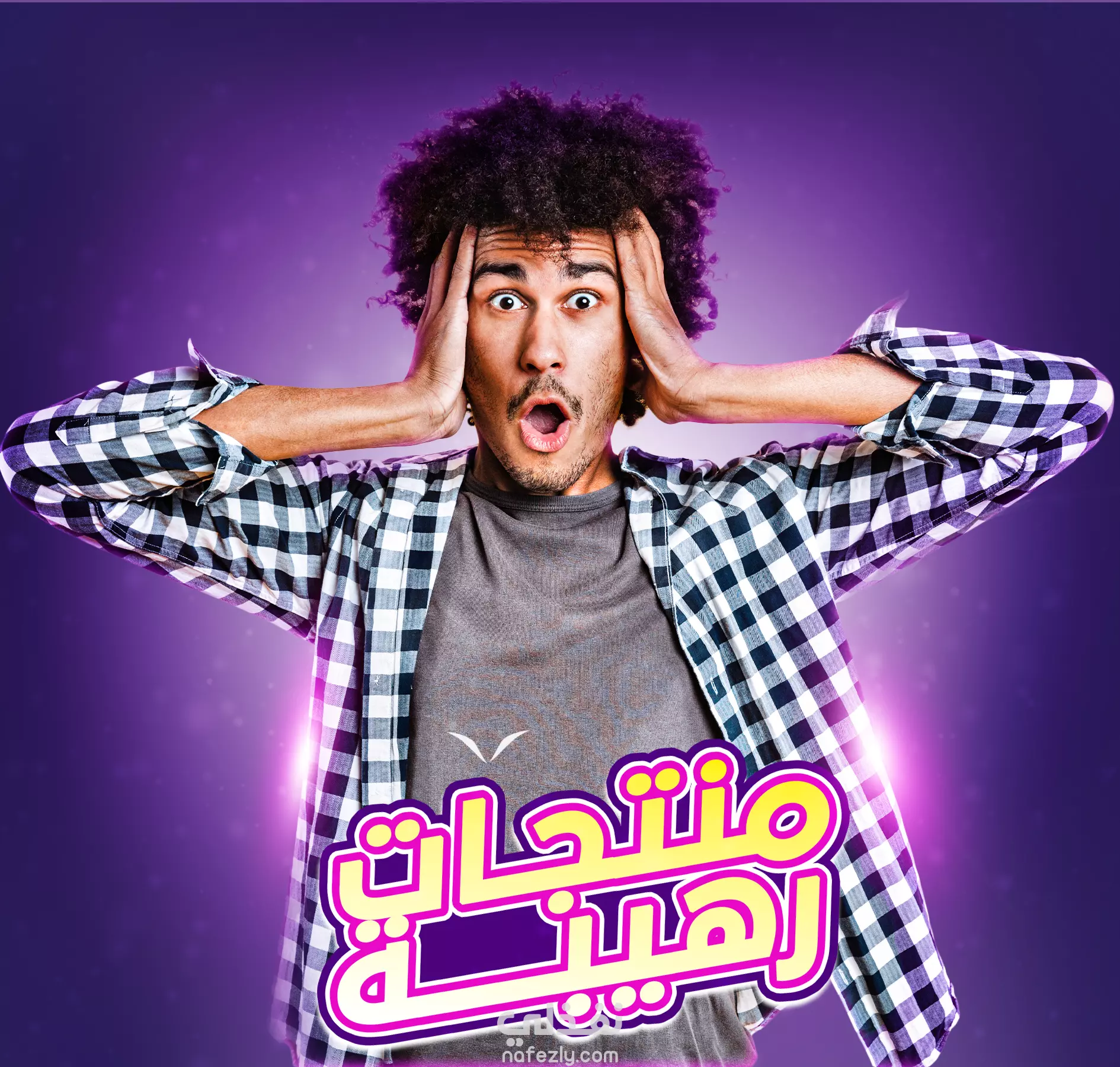 التركيز العاطفي (Emotional Focus): العنصر الأقوى هو صورة الشاب بتعبير الصدمة والدهشة (اليدين على الرأس والفم مفتوح)، مما يحاكي رد فعل المشاهد المتوقع عند رؤية المنتجات 'الرهيبة'، وهذا يخلق ارتباطًا عاطفيًا ومباشرًا. المعالجة اللونية والإضاءة: الخلفية: استخدام اللون البنفسجي الغامق والمتدرج، وهو لون مرتبط بالإبداع والفخامة. الإضاءة الساطعة (Glow Effect): وضع تأثير توهج لوني قوي (Glowing Light) يحيط بالنموذج والنص، مما يجعلهما يبرزان بقوة عن الخلفية ويشير إلى أن المنتجات هي مصدر هذا الضوء والإبهار. الخطوط والنص: النص 'منتجات رهيبة' مكتوب بخط عربي عصري وجريء وبأسلوب الفقاعات (Bubble/Graffiti Style) ومحاط بحدود نيون (Neon Outline)، مما يعزز الإحساس بالشبابية والجرأة والمرح في العرض. المهارة الفنية: تم تطبيق تقنيات الدمج الاحترافي (Compositing/Manipulation) لعزل النموذج عن الخلفية الأصلية، وتوحيد الألوان، ووضع تأثيرات الإضاءة لجعل الصورة تبدو وكأنها التُقطت في استوديو إضاءة خاص.