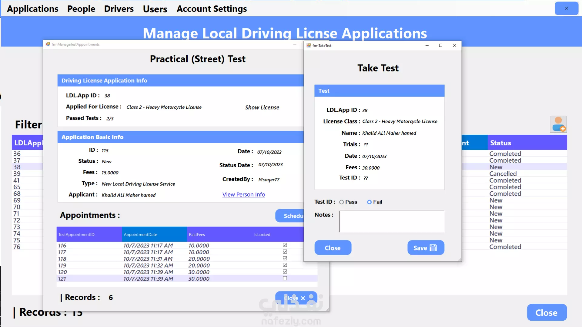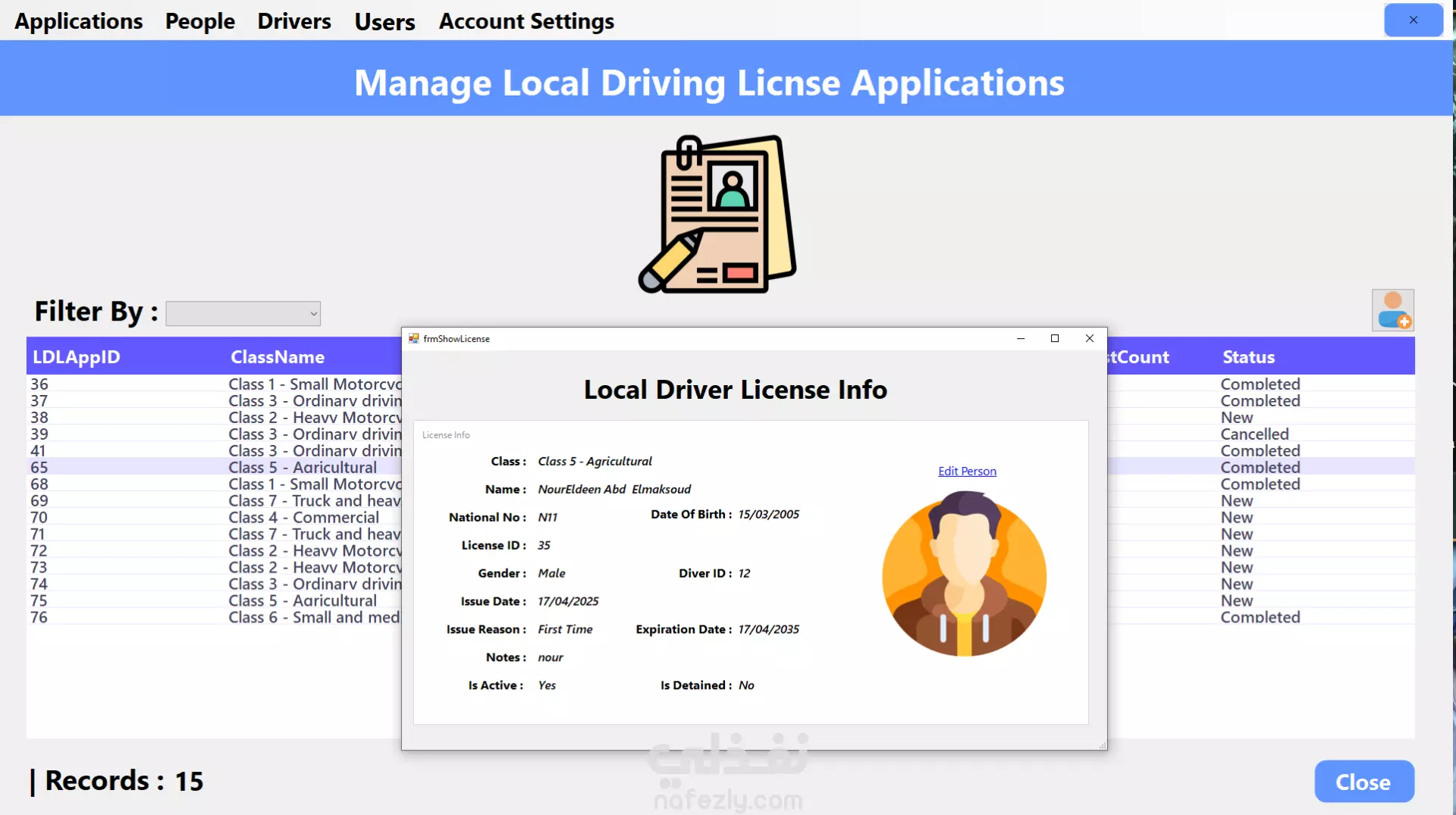 نظام DVLD هو تطبيق سطح مكتب متكامل صُمم لإدارة جميع جوانب رخص القيادة وتسجيل المركبات. تم بناء هذا التطبيق باستخدام C# وتقنية Windows Forms، ويعتمد على بنية ثلاثية الطبقات تتضمن طبقة العرض، وطبقة منطق الأعمال، وطبقة الوصول إلى البيانات. يوفر النظام حلاً شاملاً لإدارات الحكومة الخاصة برخص القيادة والمركبات، حيث يتيح إدارة فعّالة لبيانات الأفراد، ورخص القيادة، والاختبارات، والمستخدمين بمستويات وصول مختلفة.