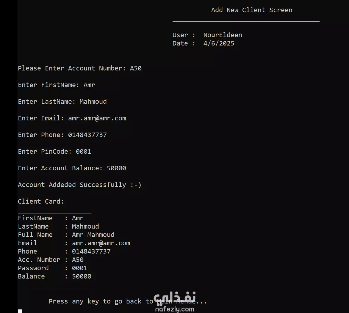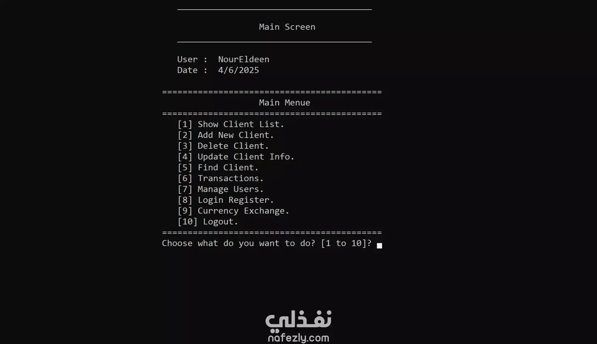 نظام إدارة بنكي متكامل تم تطويره باستخدام لغة ++C ومبادئ البرمجة الكائنية التوجه (OOP). يوفر هذا النظام واجهة تفاعلية عبر سطر الأوامر تمكّن المستخدمين من إدارة حسابات العملاء، والمعاملات المالية، وتبادل العملات، بالإضافة إلى إدارة المستخدمين مع التحكم في الصلاحيات.