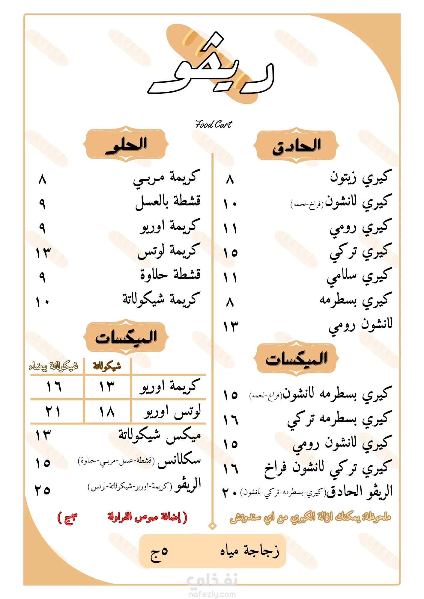 المنيو قابل للاستخدام الرقمي والطباعة، ومناسب لمقاسات الاستخدام الواقعية لعربات الطعام.