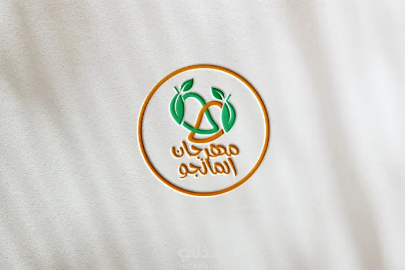 تصميم لوجو مميز يدمج ثمرتي مانجو باللونين الأخضر والبرتقالي ليرمزا للطبيعة والحيوية، مع كتابة اسم مهرجان المانجو بخط عربي أنيق وجذاب يعكس روح الاحتفال.
